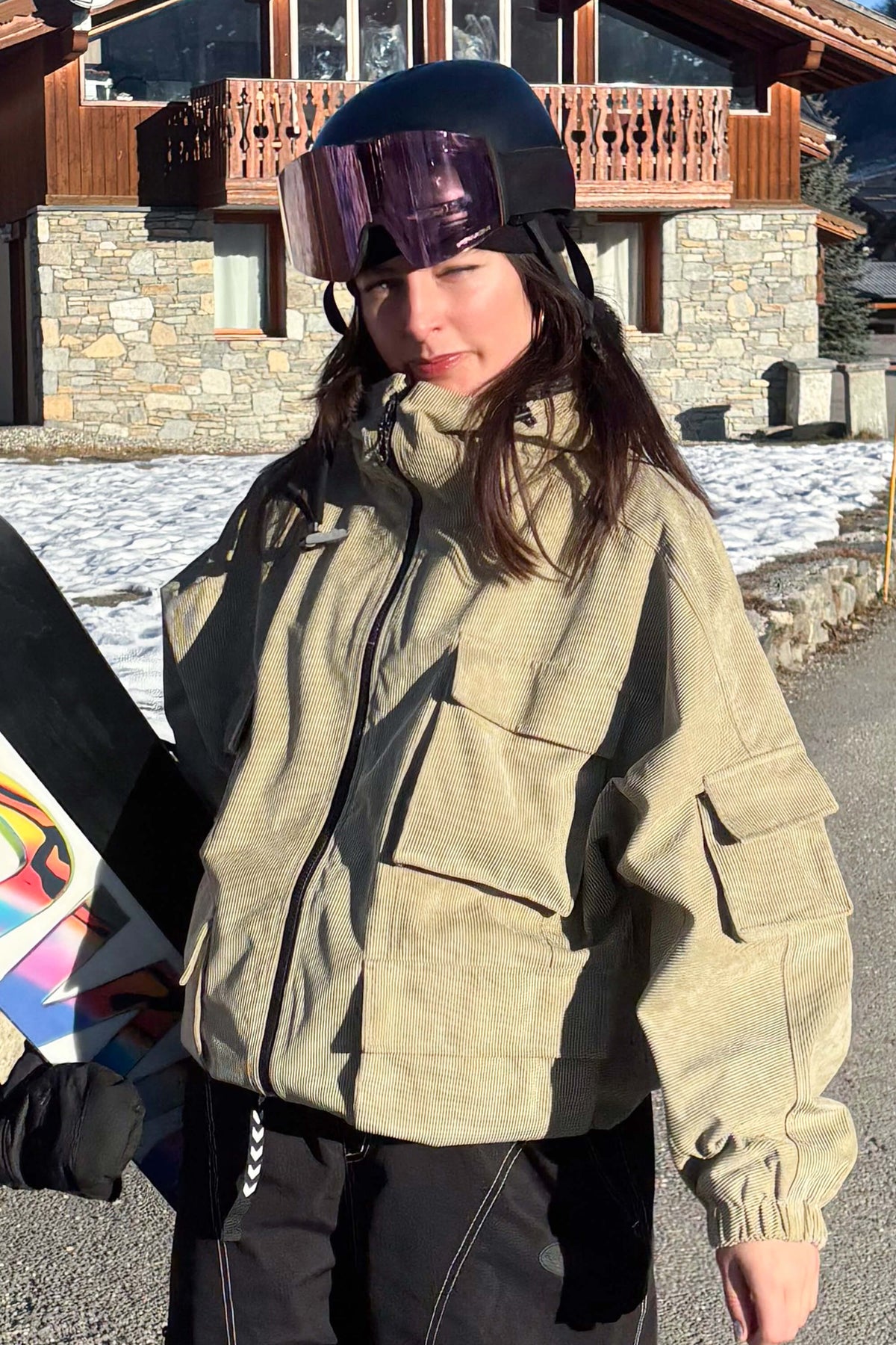 This snow jacket is made of high quality 100% polyester corduroy fabric, treated with 2L fabric pressing process and water repellent coating, making it waterproof up to 15k and moisture permeable up to 10k, together with skin-friendly fleece on the neckline, the overall is both dry and skin-friendly. Elastic cuffs and drawstring hem, effectively organizing powder snow intrusion. Multiple pockets are designed to provide extra storage space for a variety of needs while skiing.