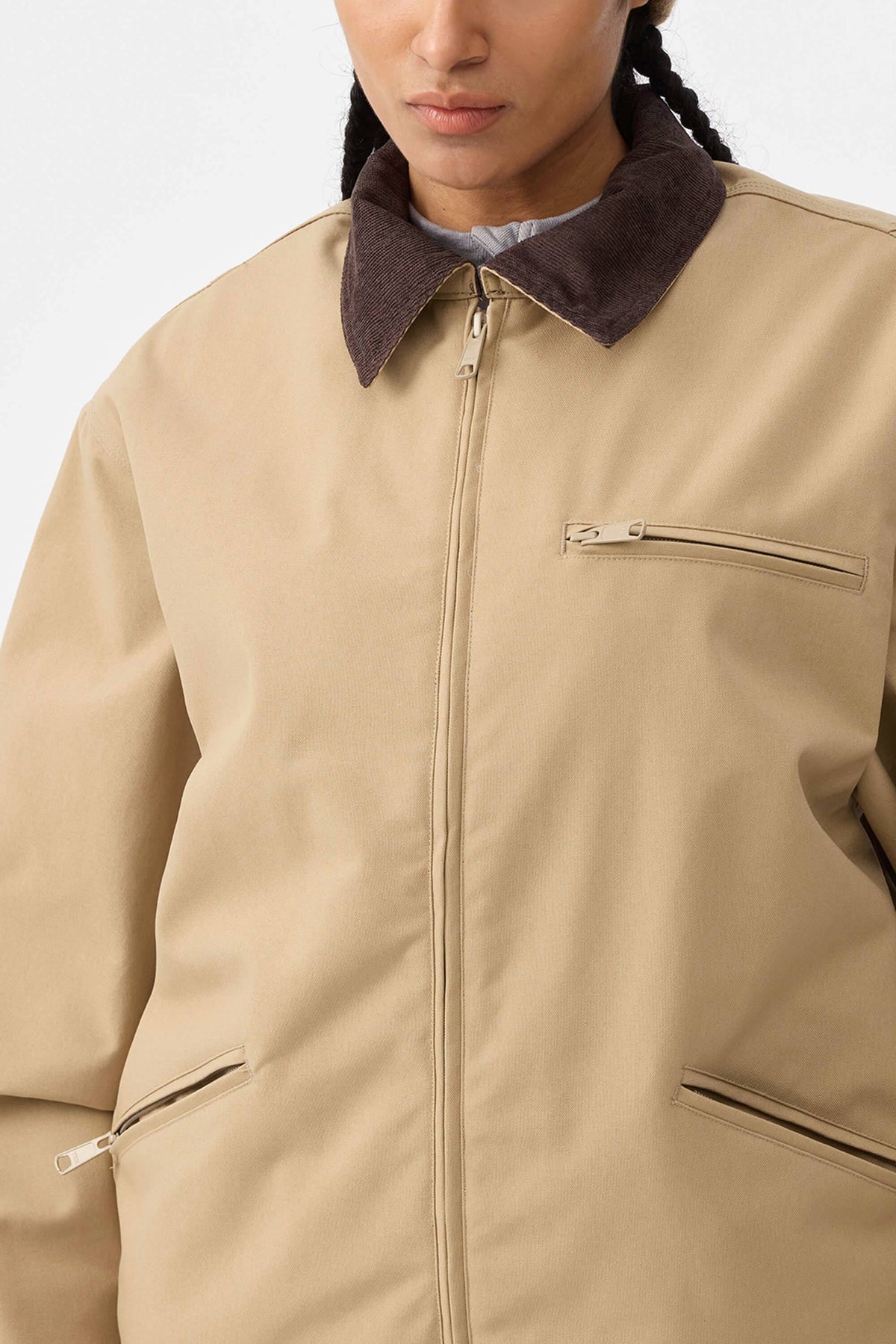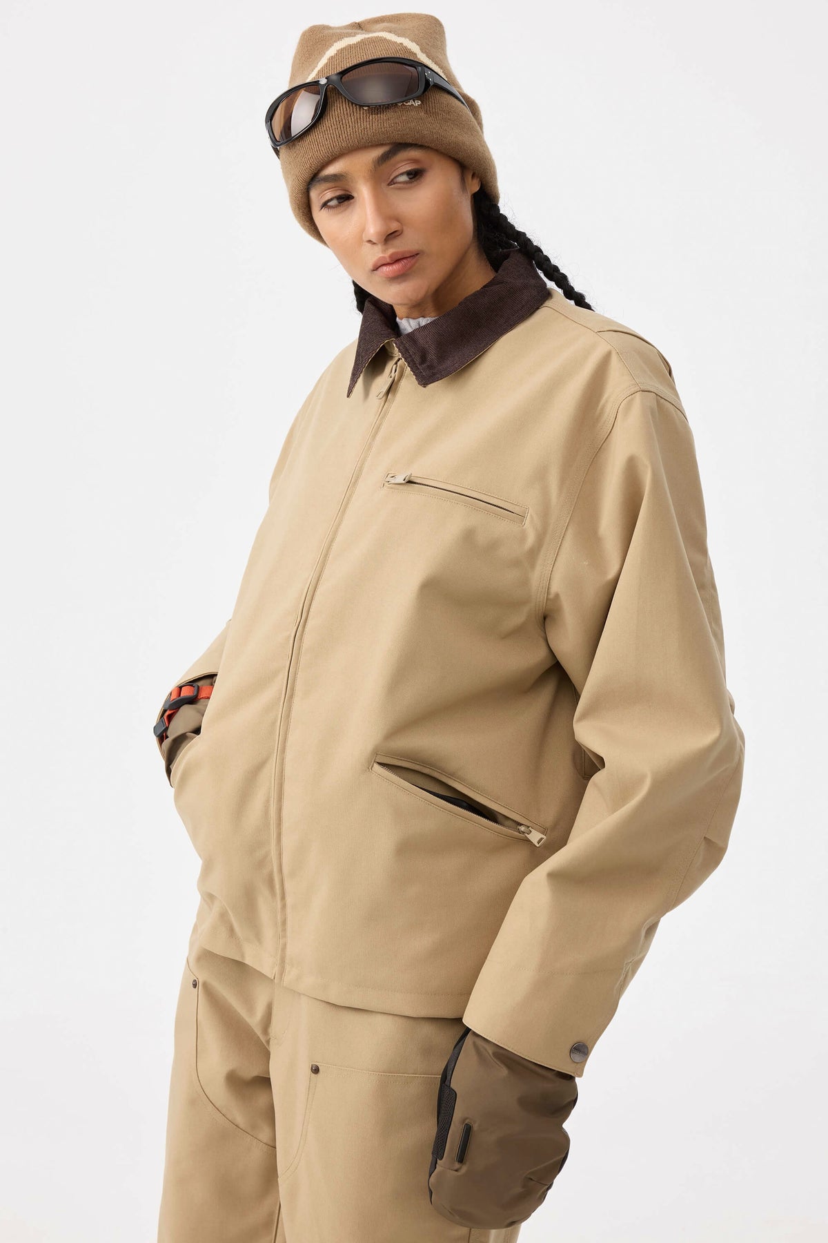 With a crisp boxy silhouette and contrast corduroy collar, this jacket blends retro workwear influences with modern utility. Its durable, structured shell offers water-repellent and breathable comfort, perfect for everyday winter wear on and off the slopes.