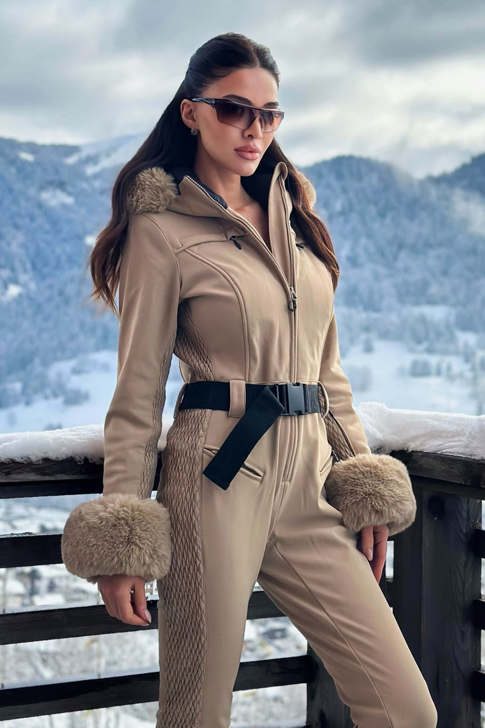 Khakifarbener, wasserdichter Skianzug aus gerafftem Kunstfell für Damen