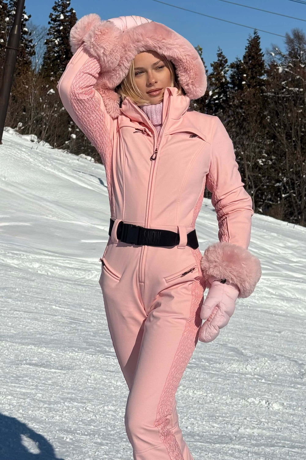 Rosafarbener, wasserdichter Skianzug aus gerafftem Kunstfell für Damen