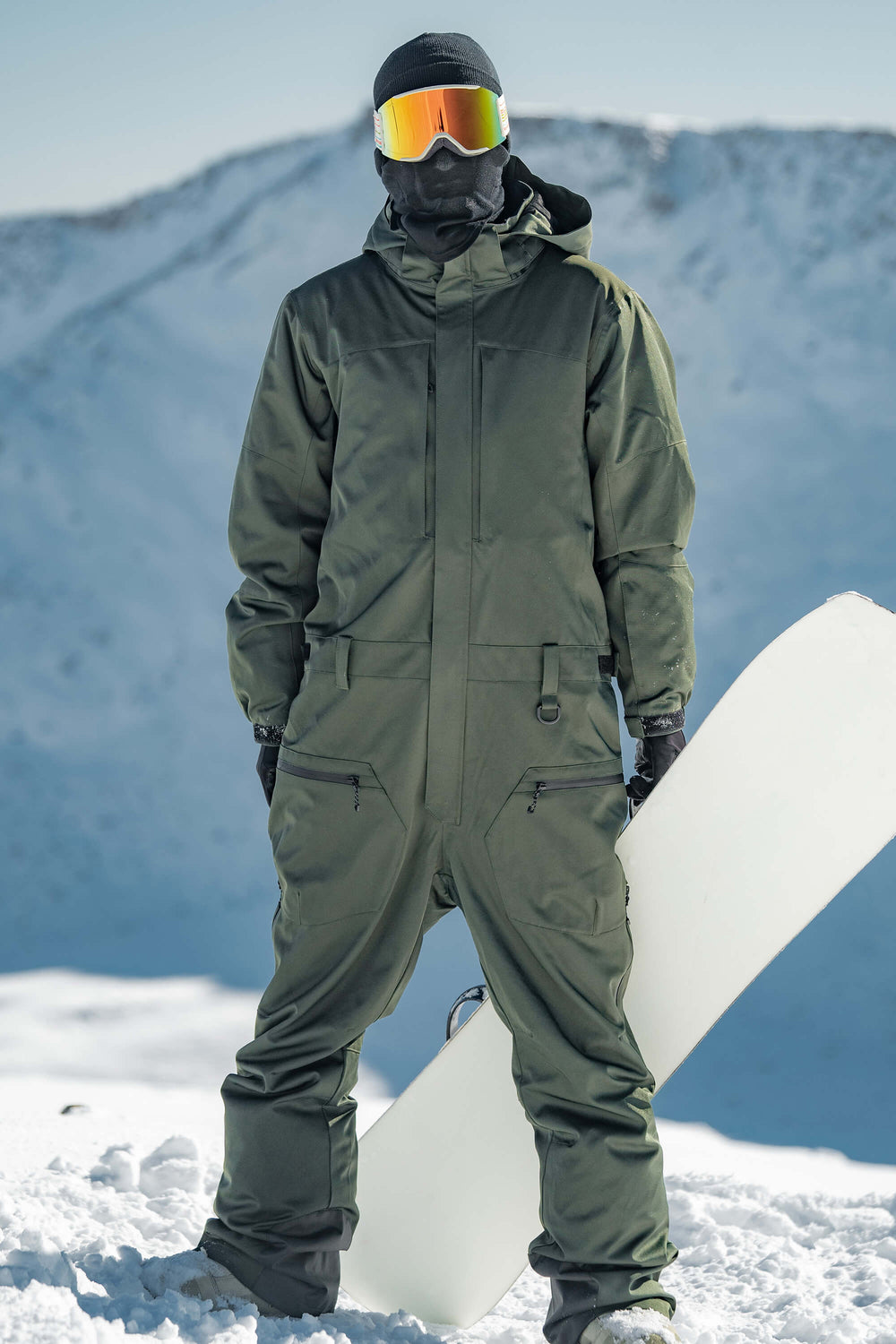 Stilvoller, wasser- und winddichter, locker sitzender einteiliger Skianzug für Herren in Armeegrün mit abnehmbarer Kapuze und mehreren Taschen