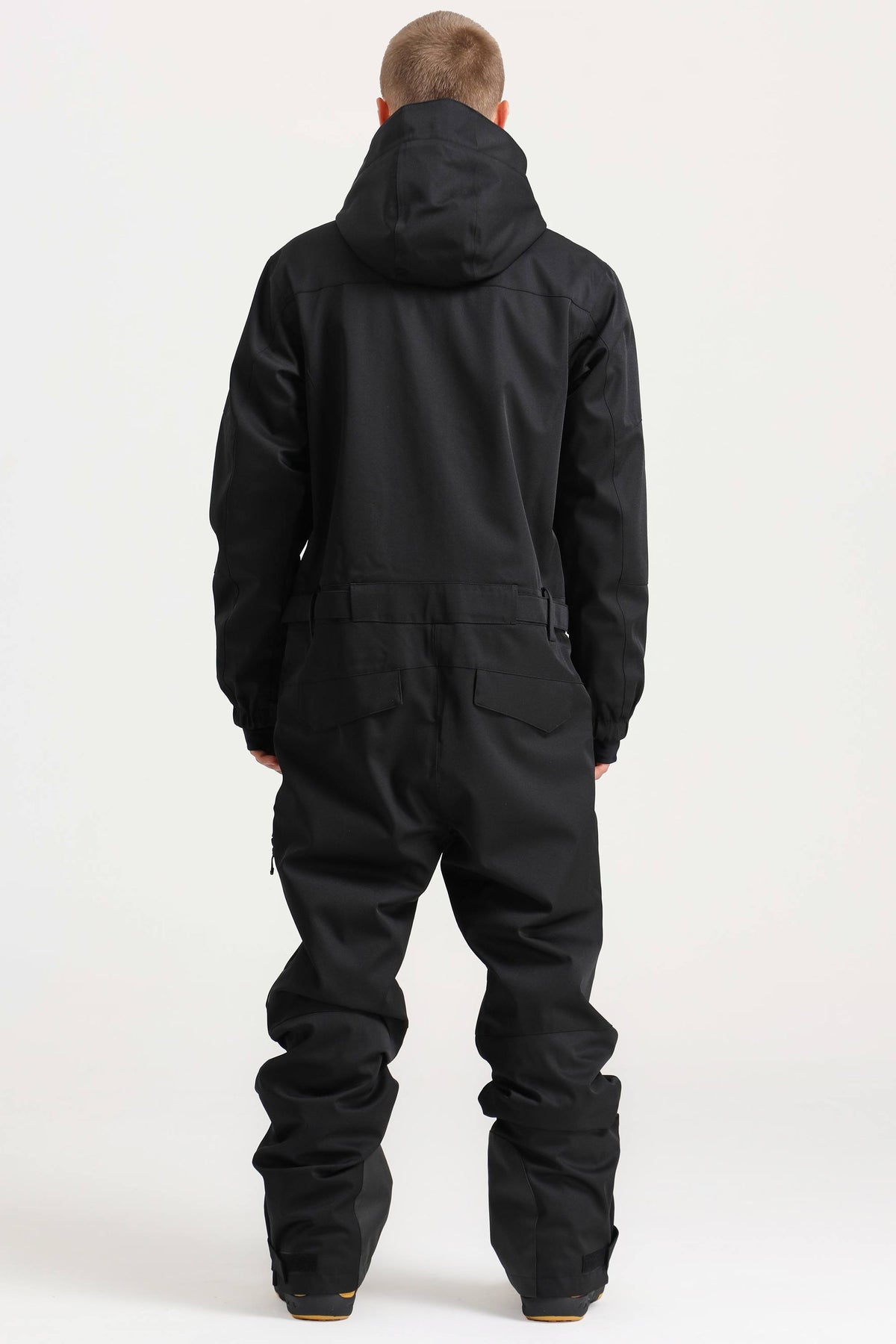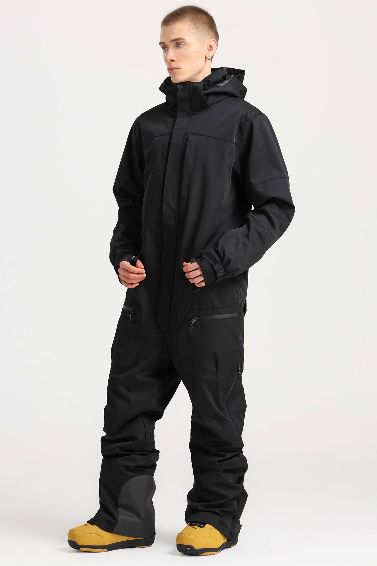 Schwarzer, stylischer, wasser- und winddichter, locker sitzender einteiliger Skianzug für Herren mit abnehmbarer Kapuze und mehreren Taschen