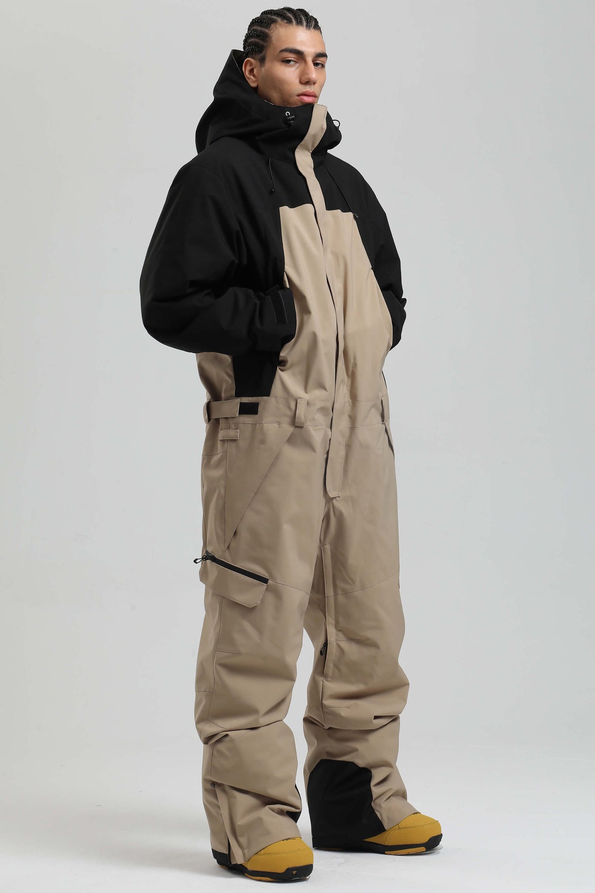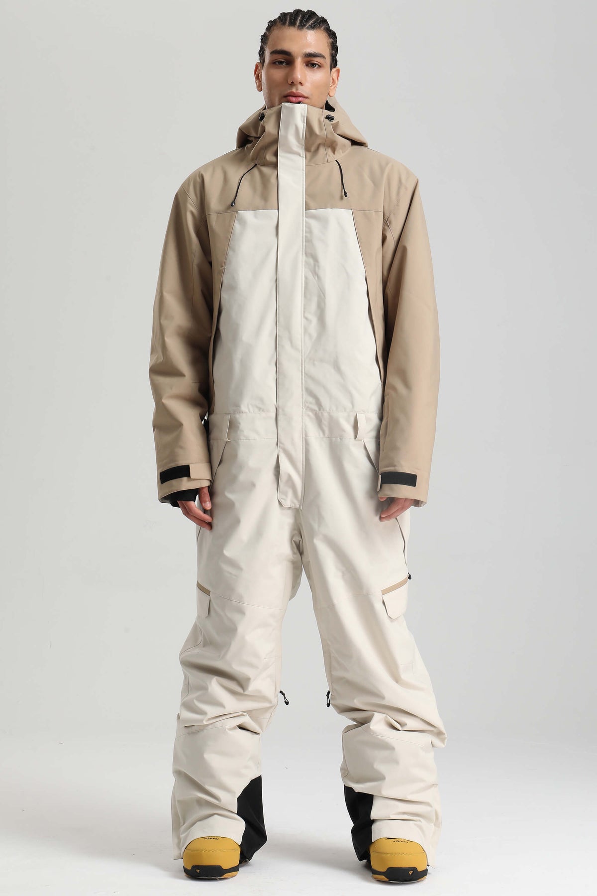 Khaki-weißer isolierter Utility-Baggy-Einteiler-Skianzug im Colorblock-Design für Herren