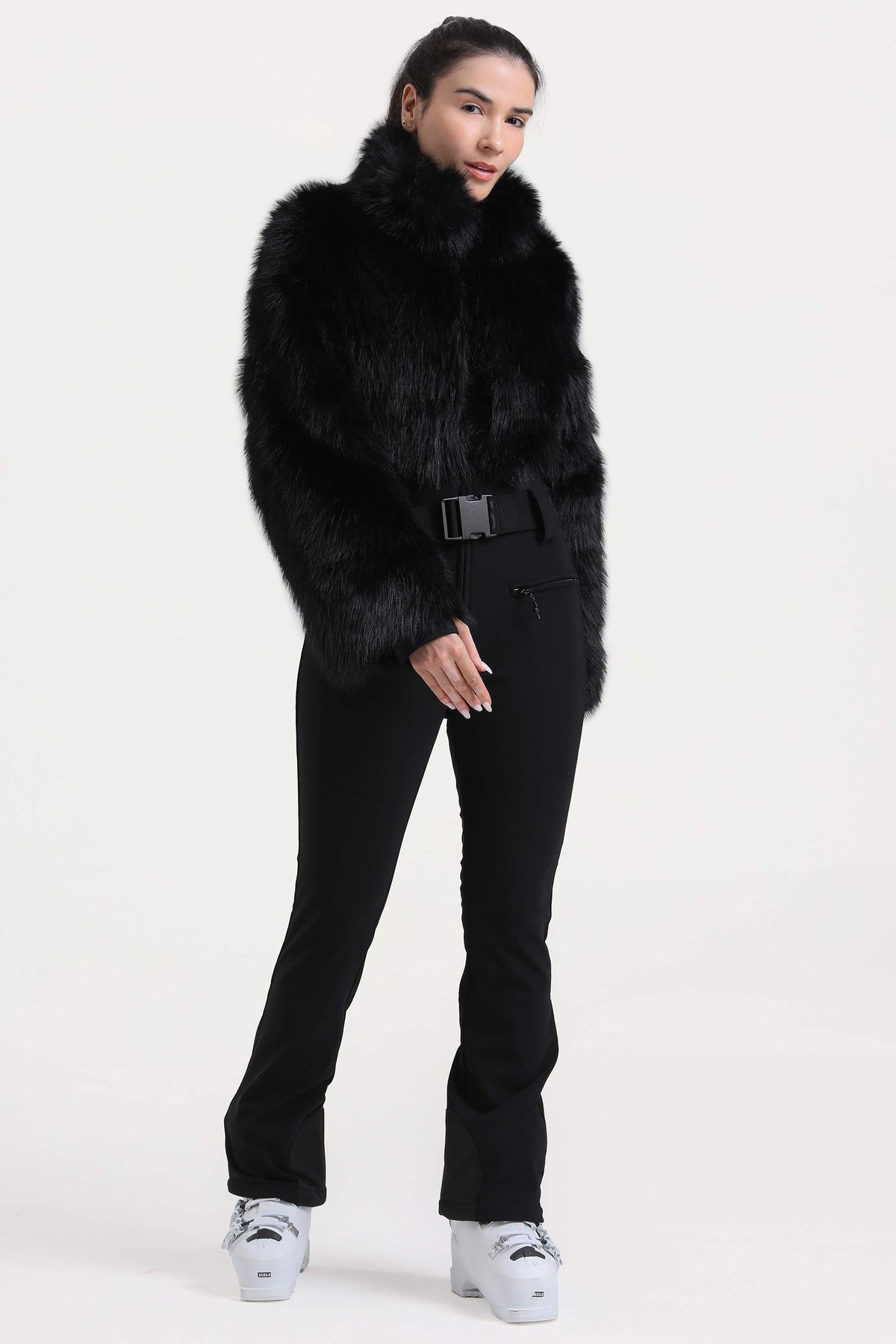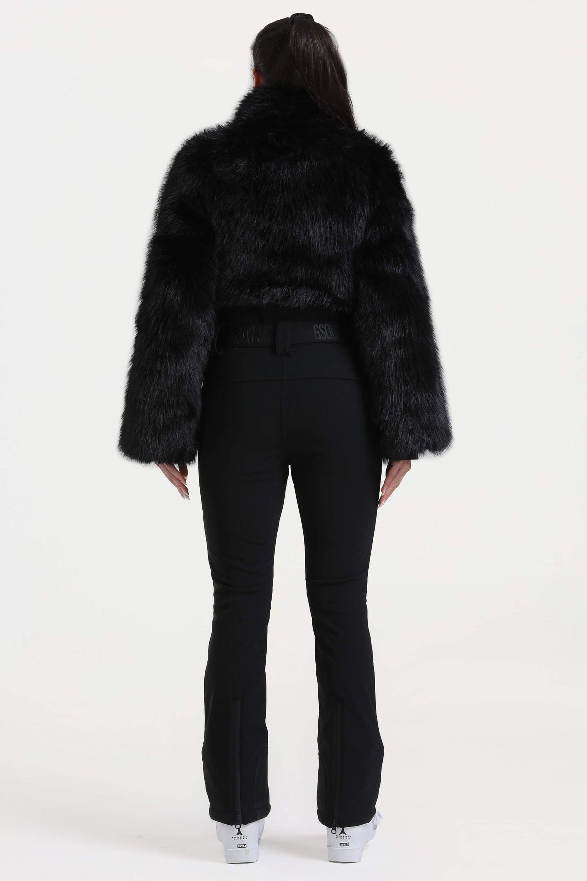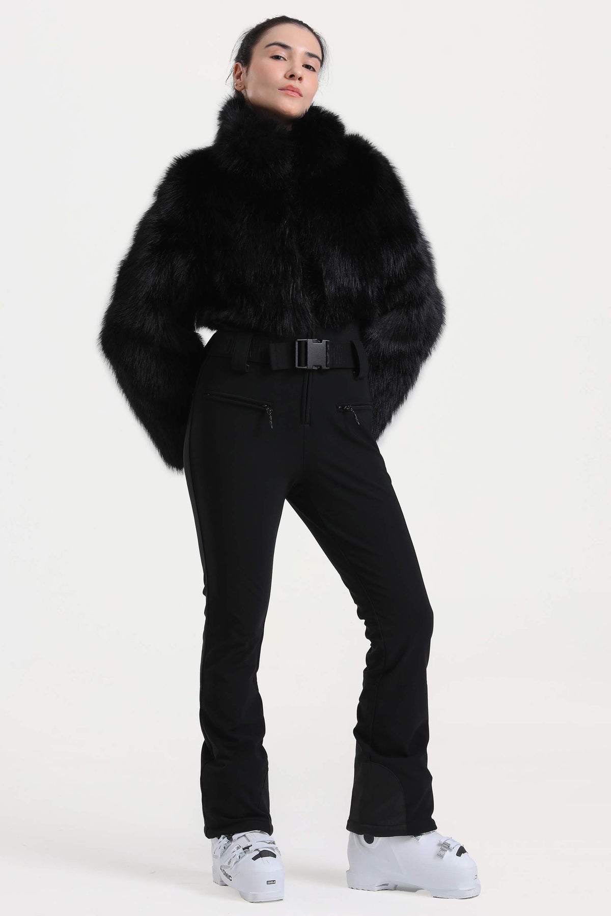Schwarzer, modischer, schmal geschnittener, einteiliger Skianzug aus Stretchmaterial für Damen mit Jacke aus Kunstfuchspelz und ausgestellten Beinen