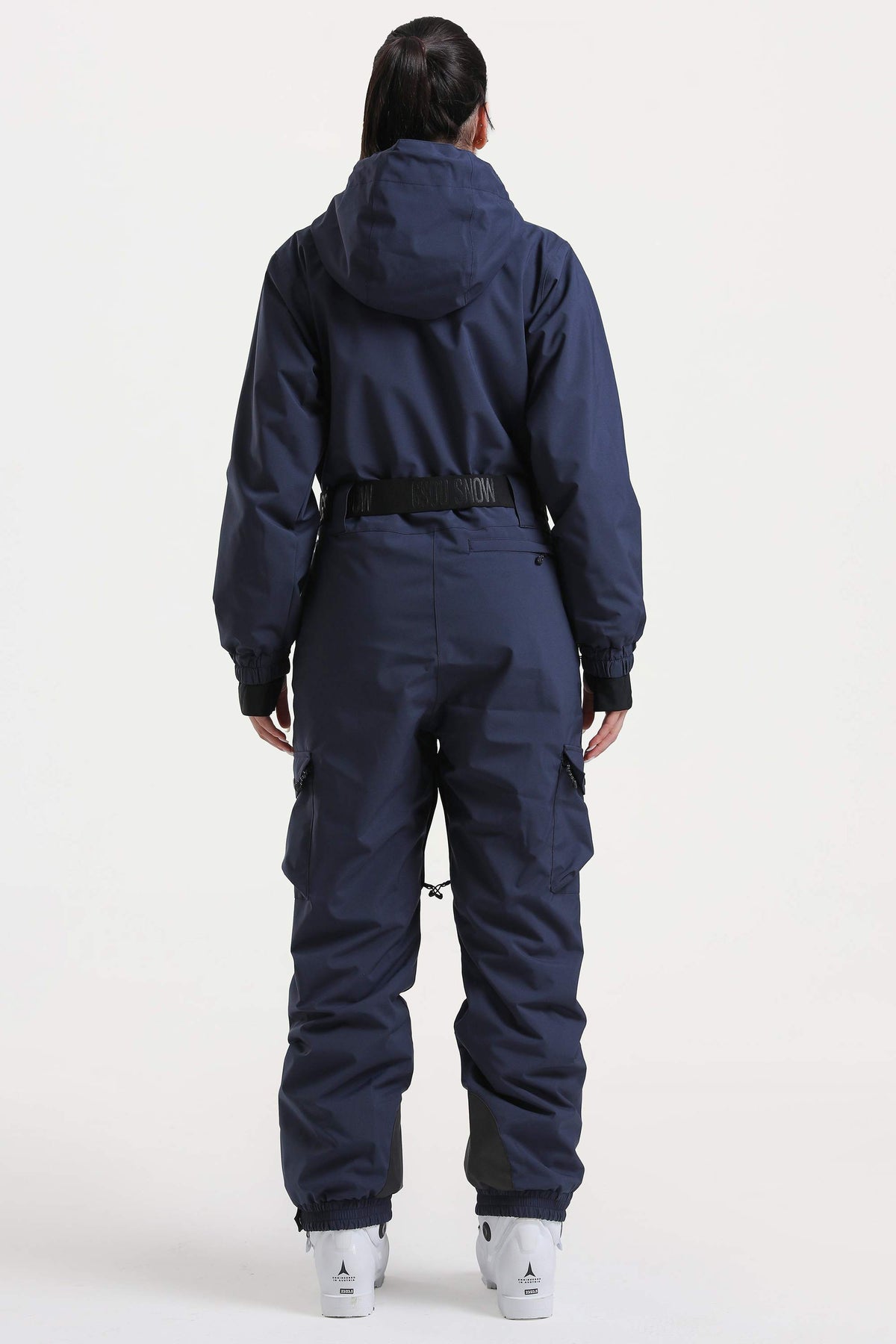 Marineblauer, isolierter, wasserdichter, einteiliger Skianzug für Damen mit asymmetrischem Design und Gürtel