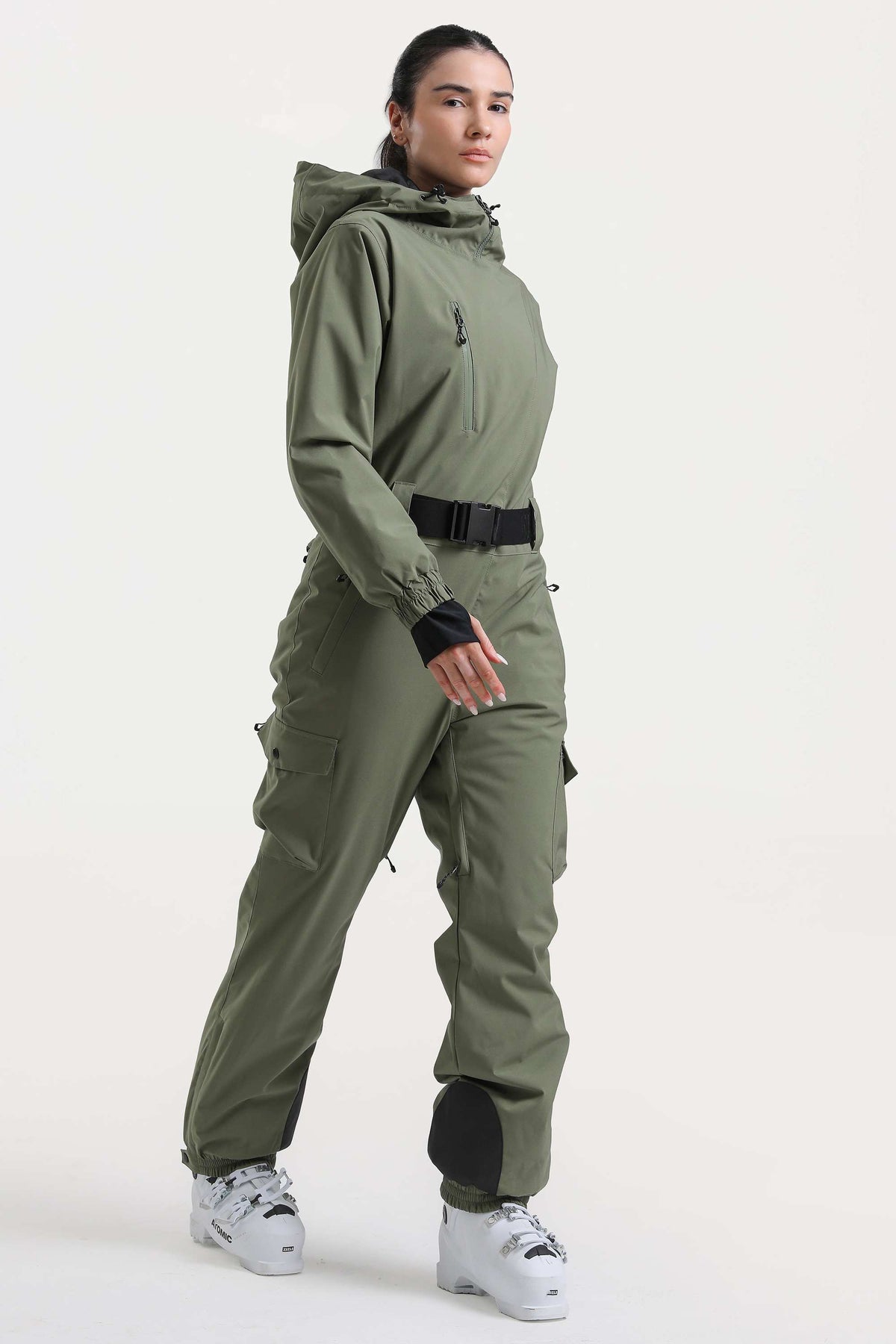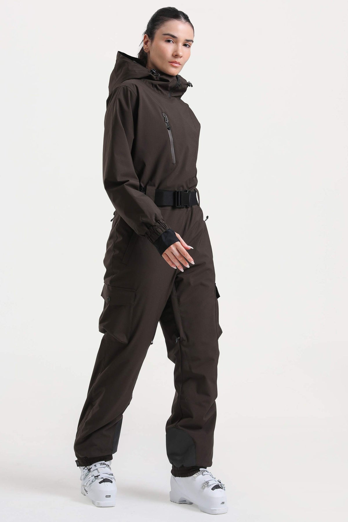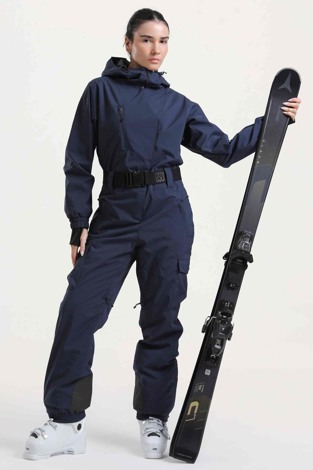 Dieser isolierte, einteilige Skianzug besticht durch sein markantes, asymmetrisches Frontdesign und bietet wasser- und winddichten Schutz. Eine verstellbare Kapuze, ein abnehmbarer Gürtel und Hosenträger sorgen für einen sicheren Sitz, während Belüftungsöffnungen Sie bei Aktivitäten kühl halten. Mehrere versteckte Reißverschlusstaschen und verstärkte Beinöffnungen mit Schneegamaschen machen ihn ideal zum Skifahren, Snowboarden und für alle Wintersportarten.