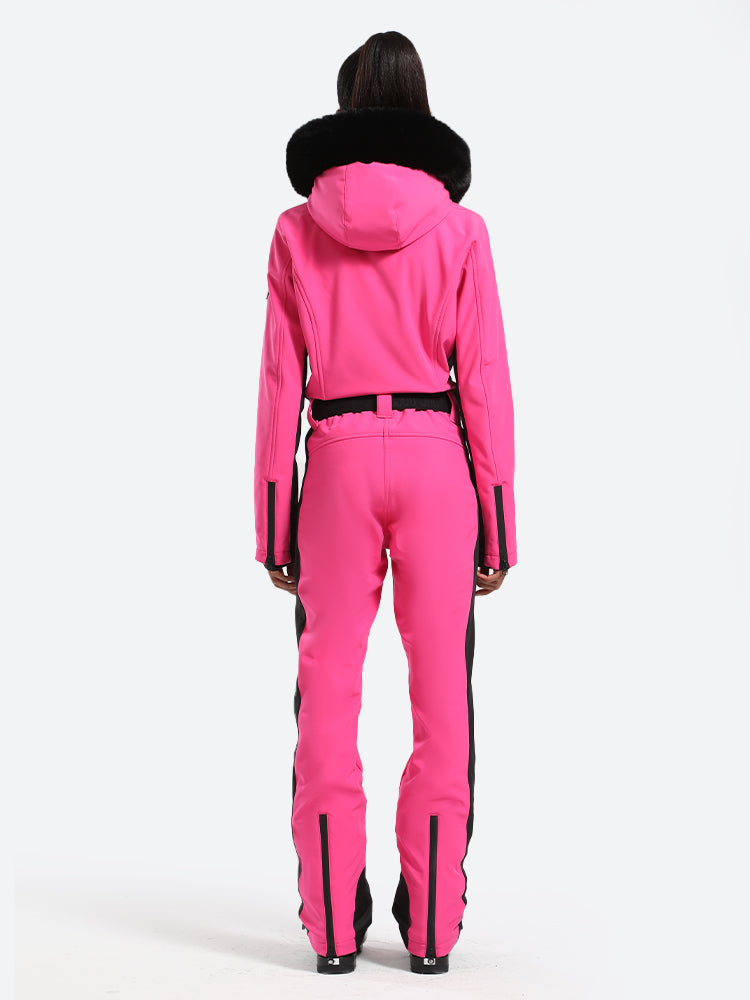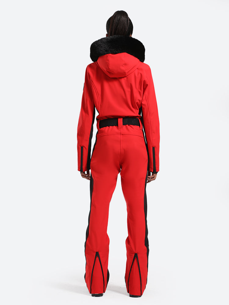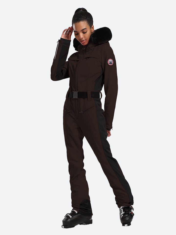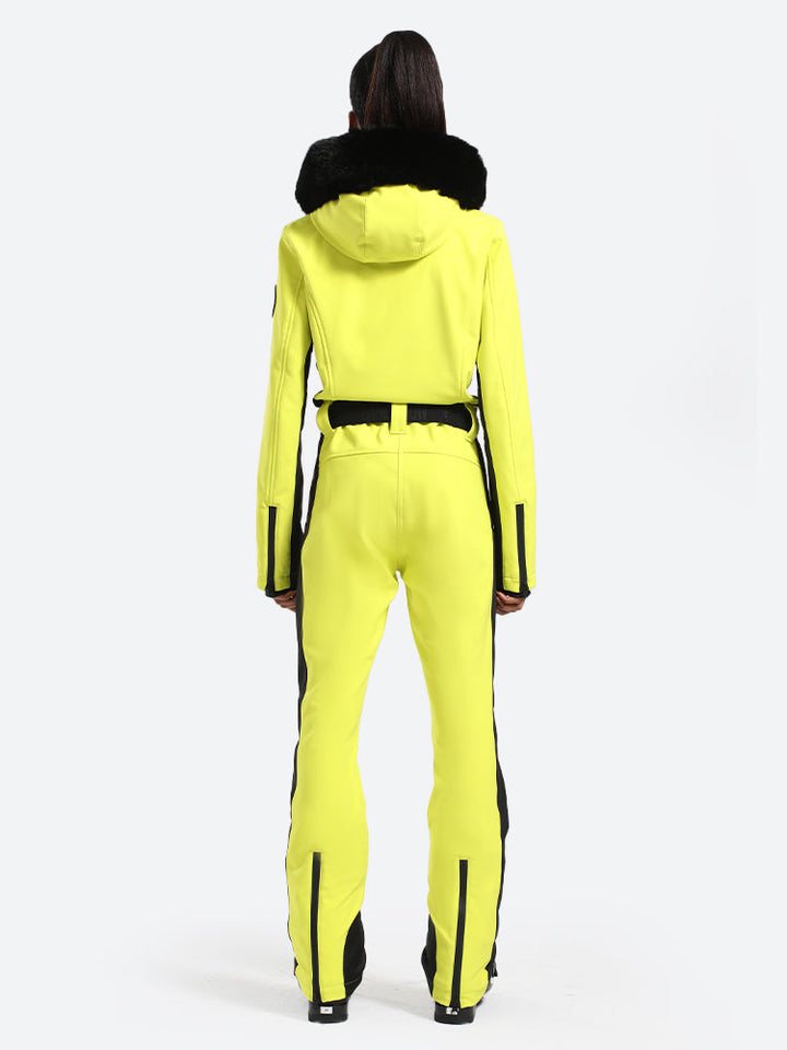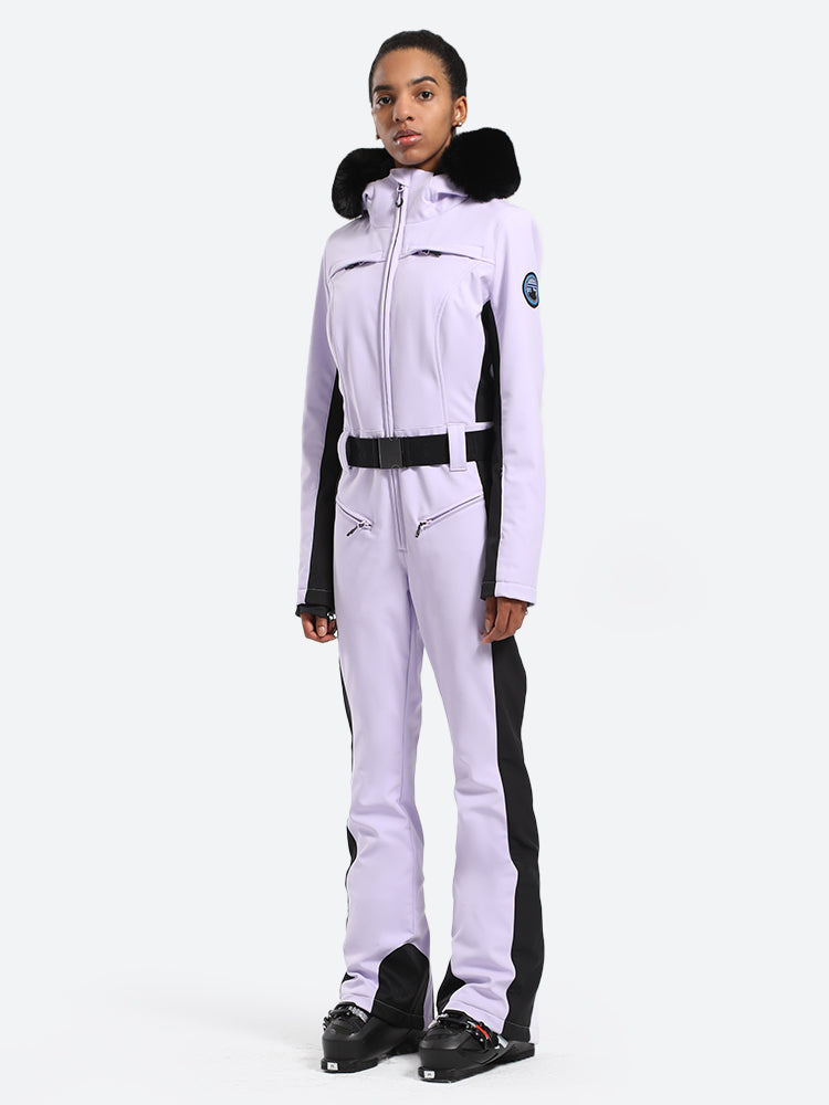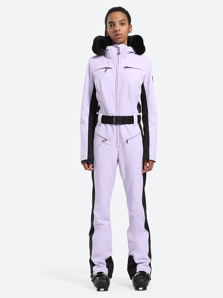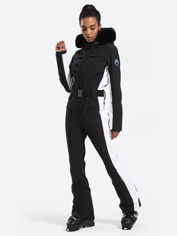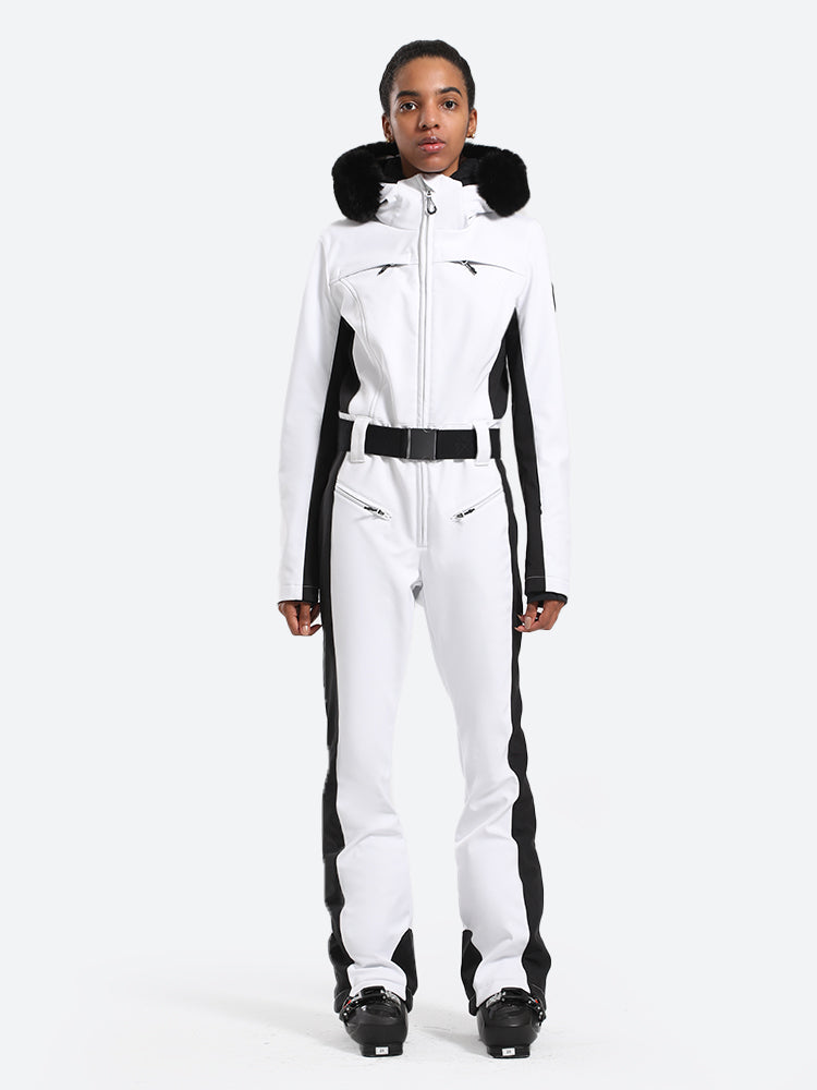 Minimalistische einteilige Skianzüge aus Kunstpelz in Weiß und Schwarz für Damen