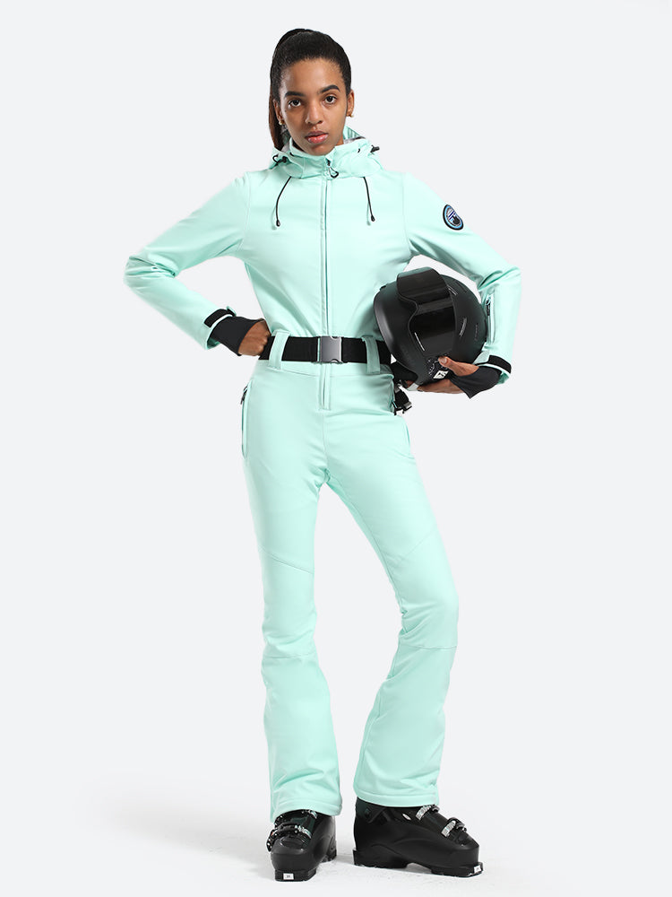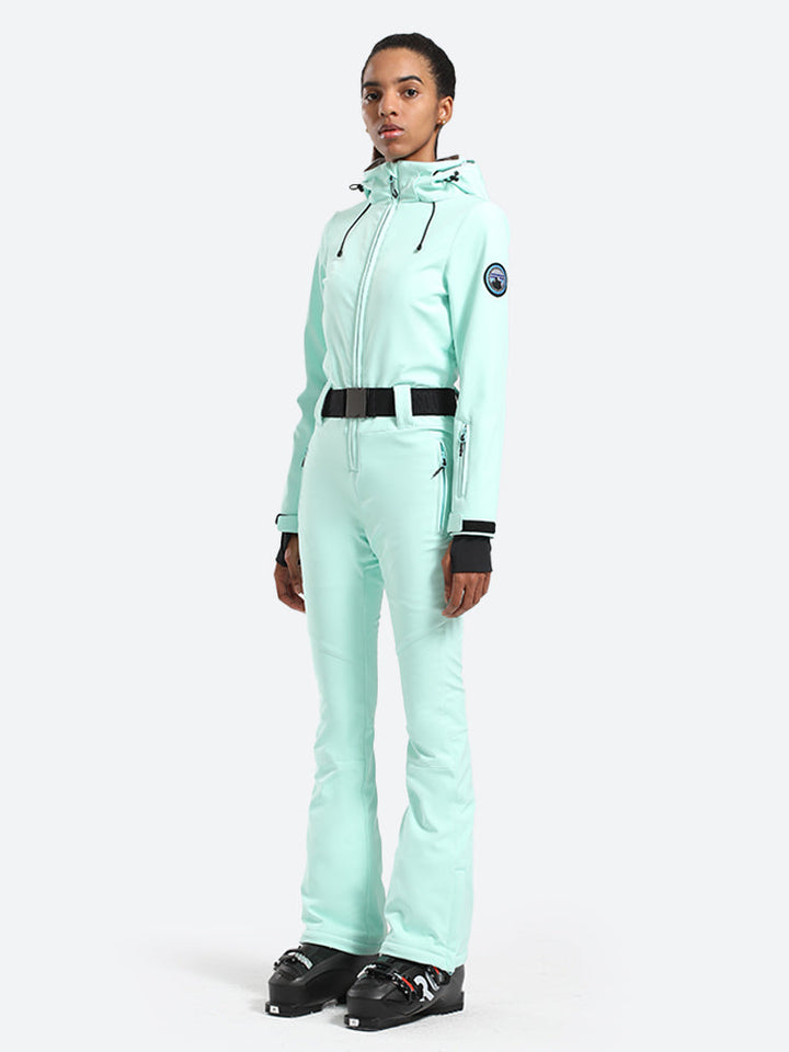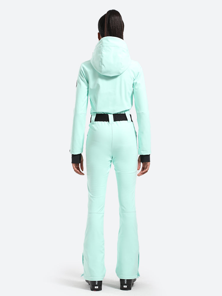 Neongrüner einteiliger Skianzug für Damen mit abnehmbarer Kapuze