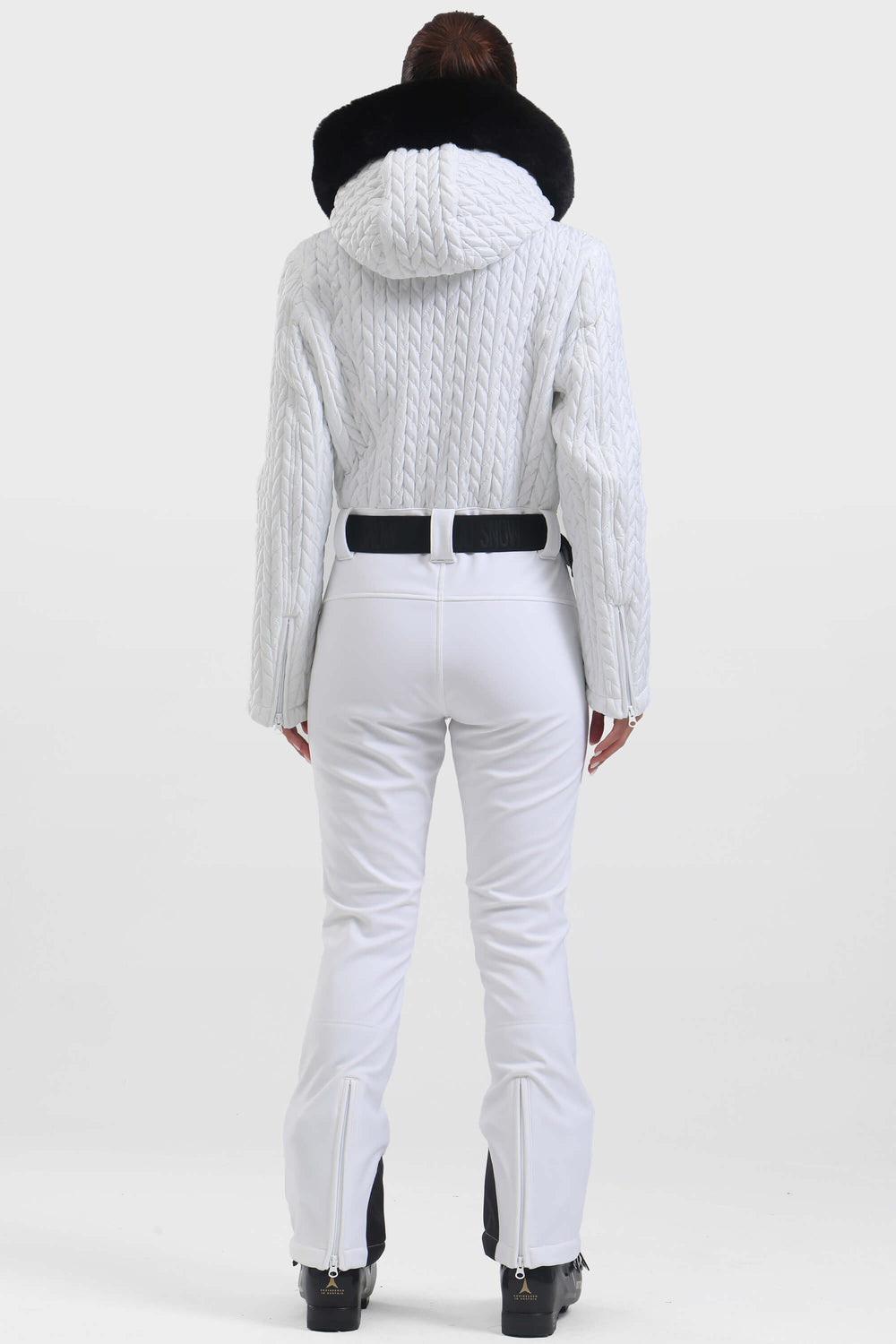 Combinaison de ski une pièce blanche élégante et ajustée pour femme avec veste amovible en fausse fourrure de renard et jambes évasées