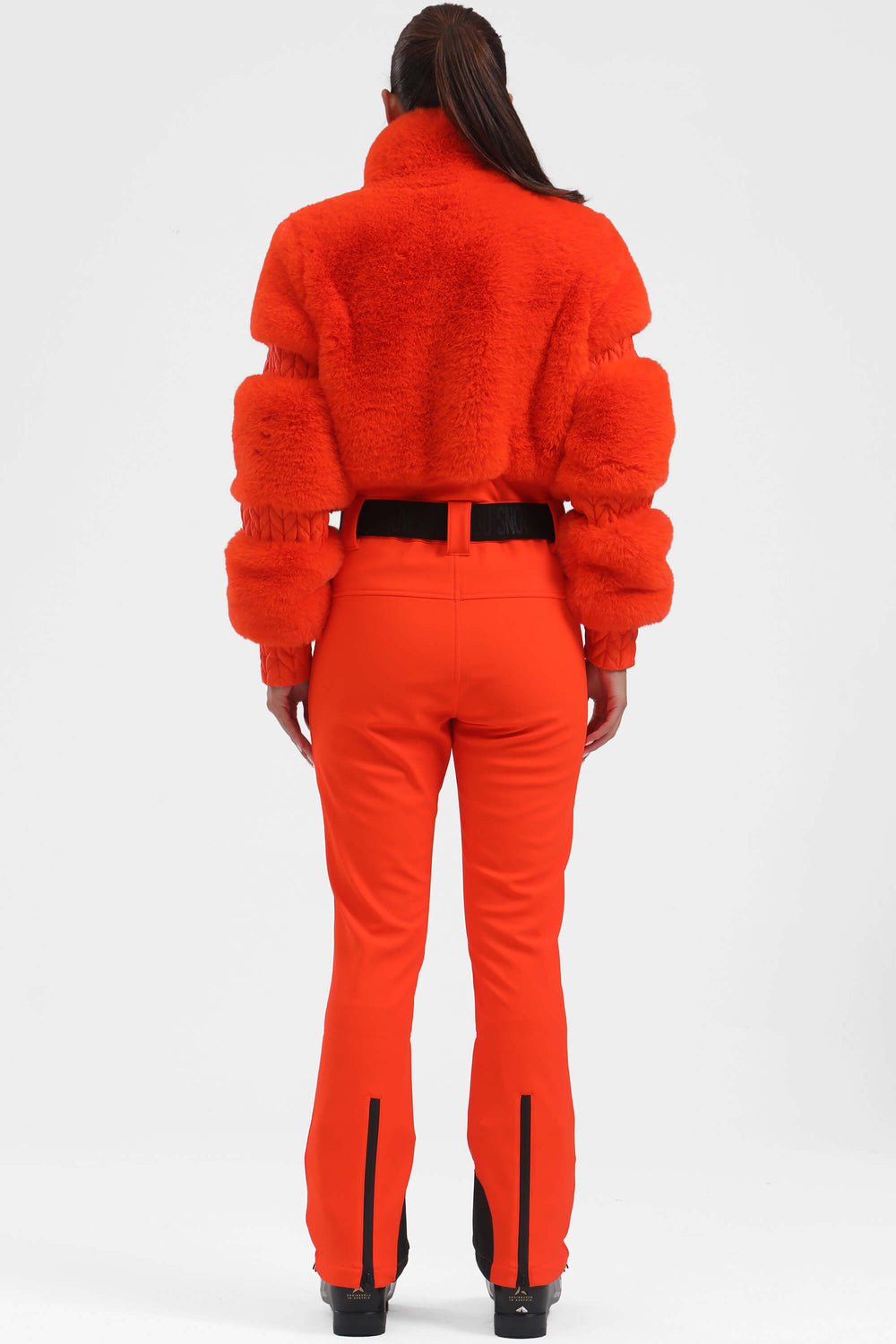 Combinaison de ski imperméable une pièce en fausse fourrure rouge fluo pour femme