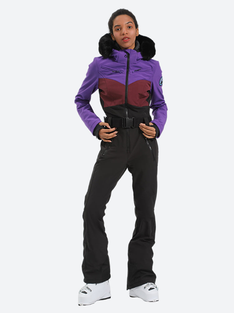 Combinaison de ski imperméable une pièce en fausse fourrure magenta pour femme