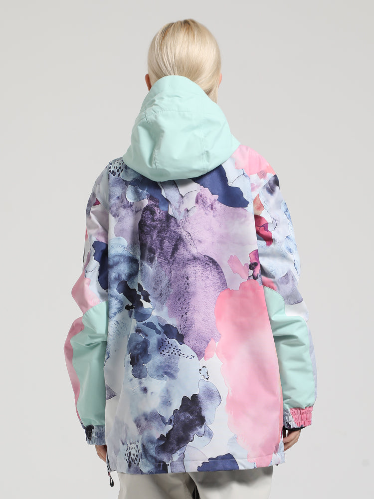 その GSou Snow スキーパーカーは100%ポリエステル素材を使用し、鮮やかなカラーリングが特徴です。特徴的なのは、パーカー中央の特大ポケット。3辺に防水ジッパーが付いています。裾にはスナップボタン付きの防風スカートが付いています。