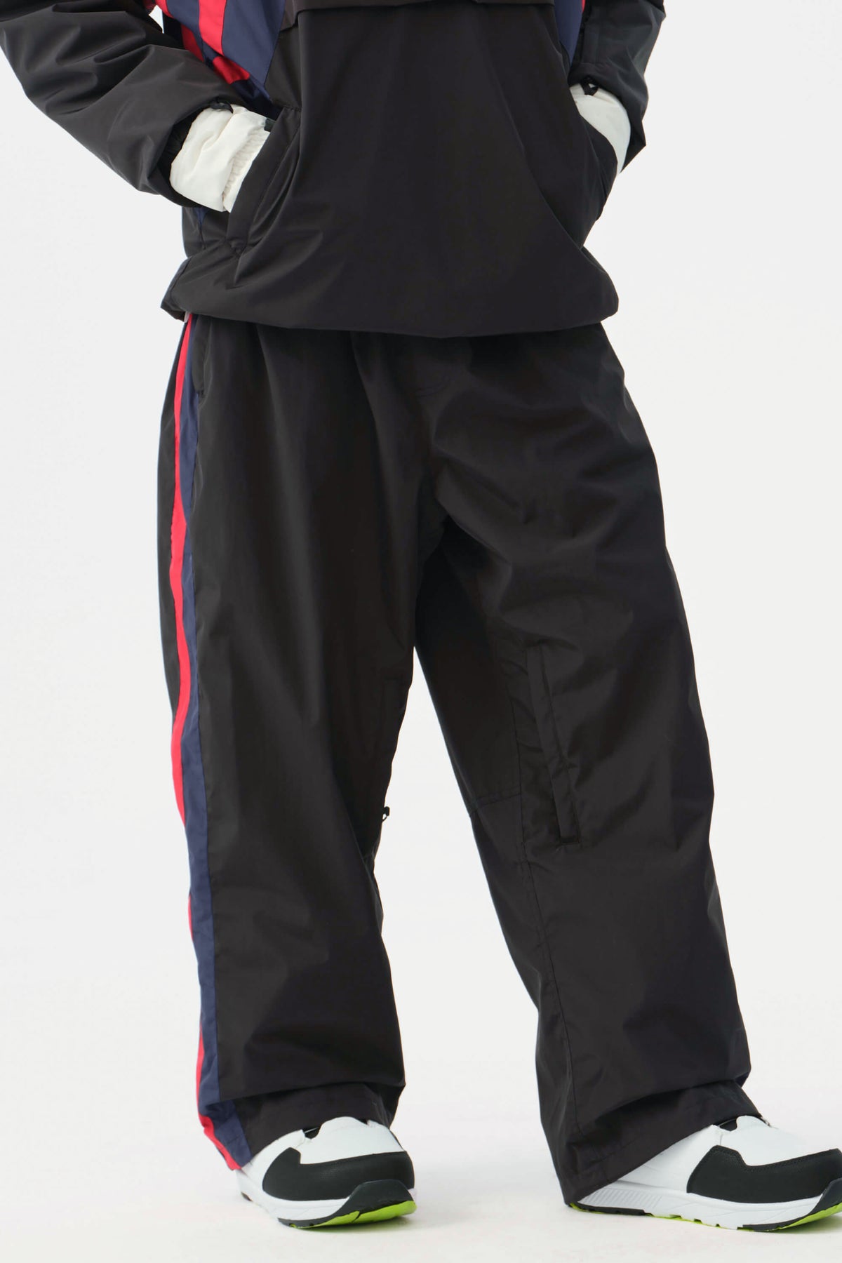 Heren zwarte en rode 90s retro track colorblock baggy sneeuwbroek