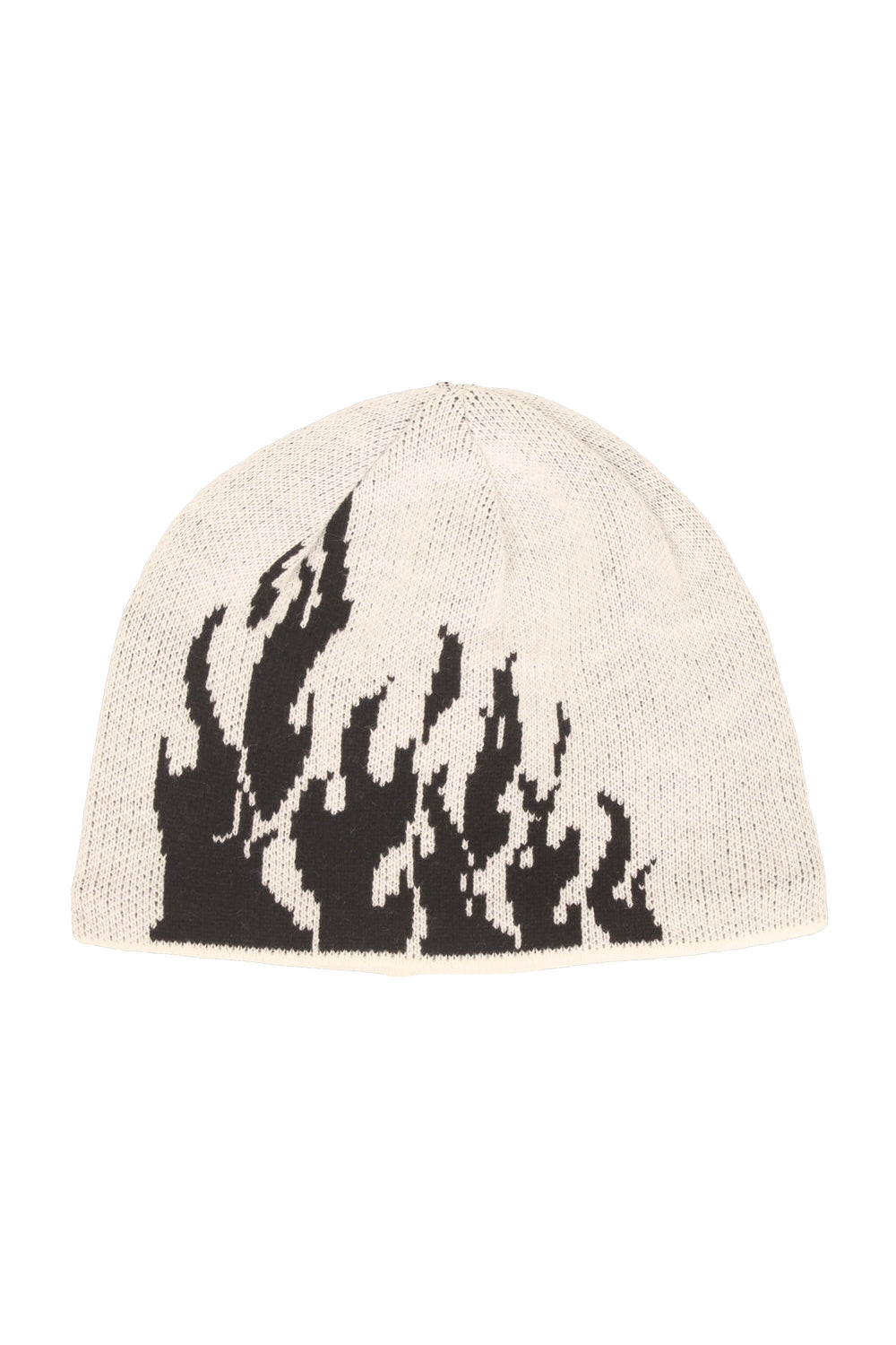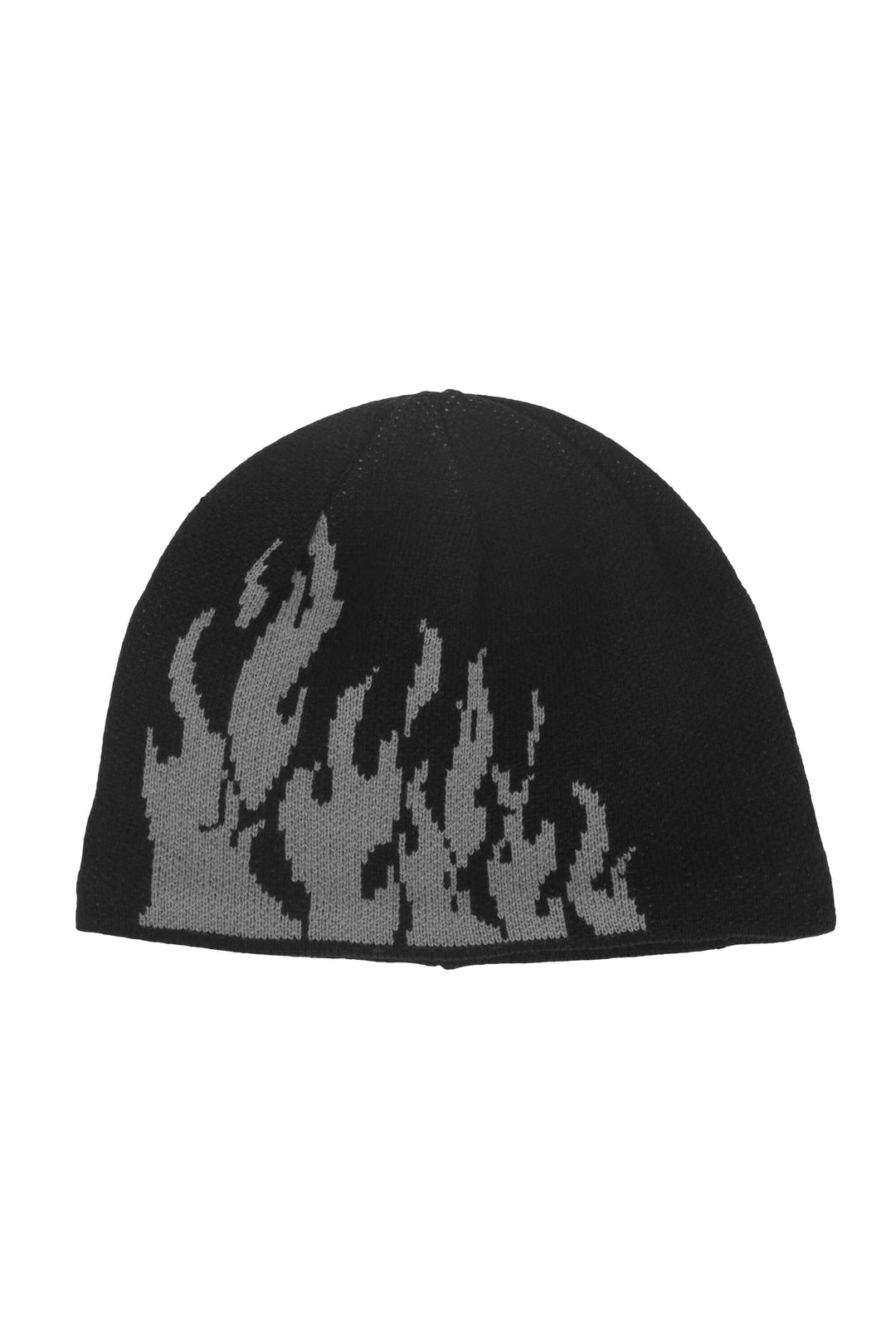 Czapka beanie unisex w kolorze czarnym z płomieniami, bez mankietów i z oddychającym wykończeniem