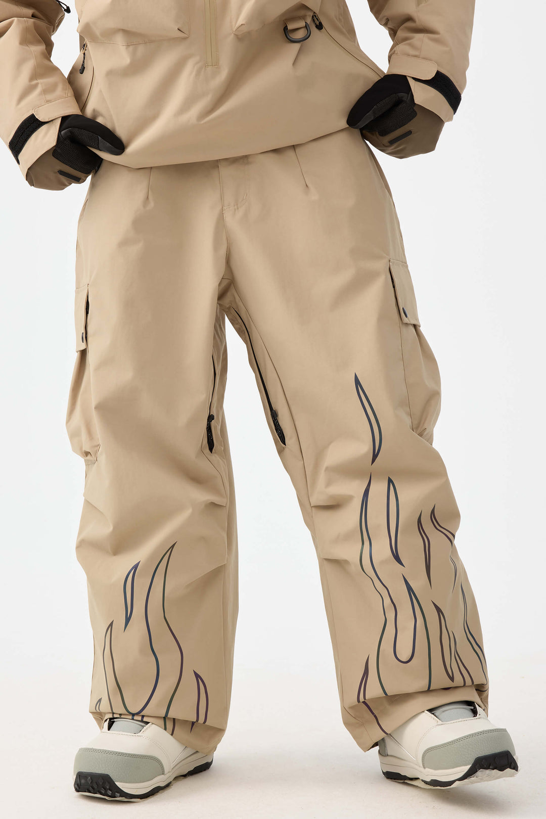Damskie spodnie narciarskie Baggy Utility w kolorze khaki, odblaskowe i z efektem płomienia