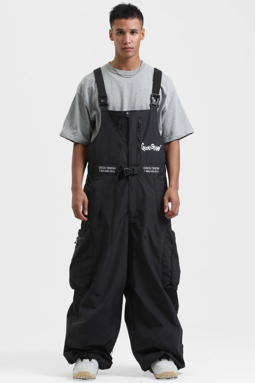 Men's Black Workwear Style Built-in Belt Super Baggy Snow Bibs