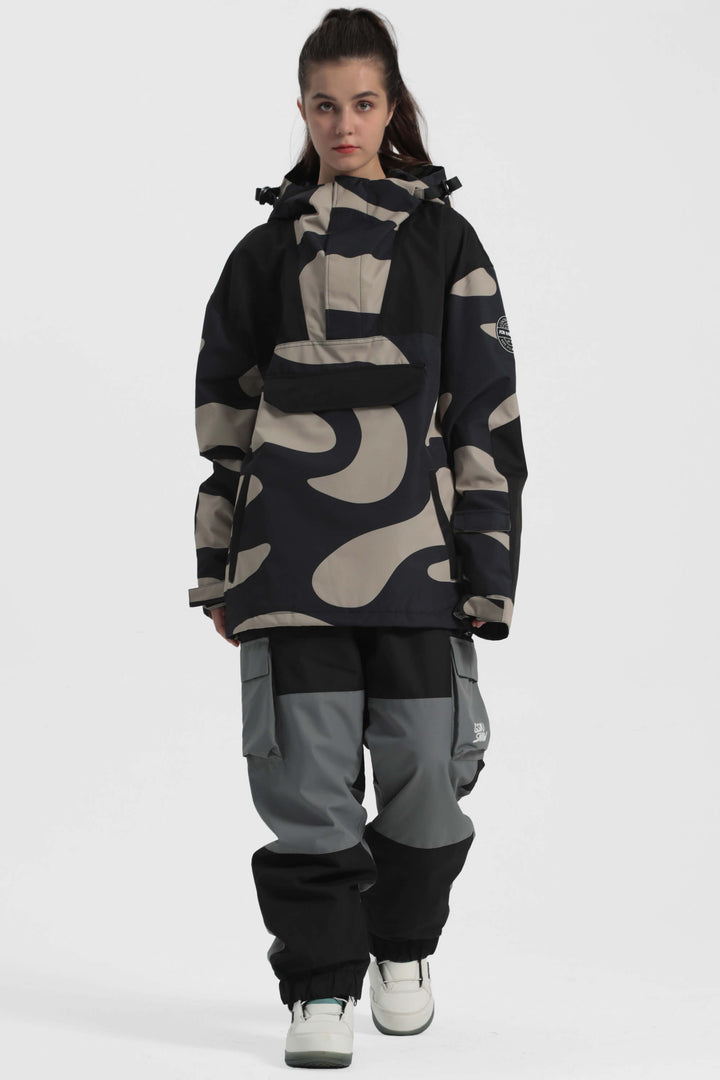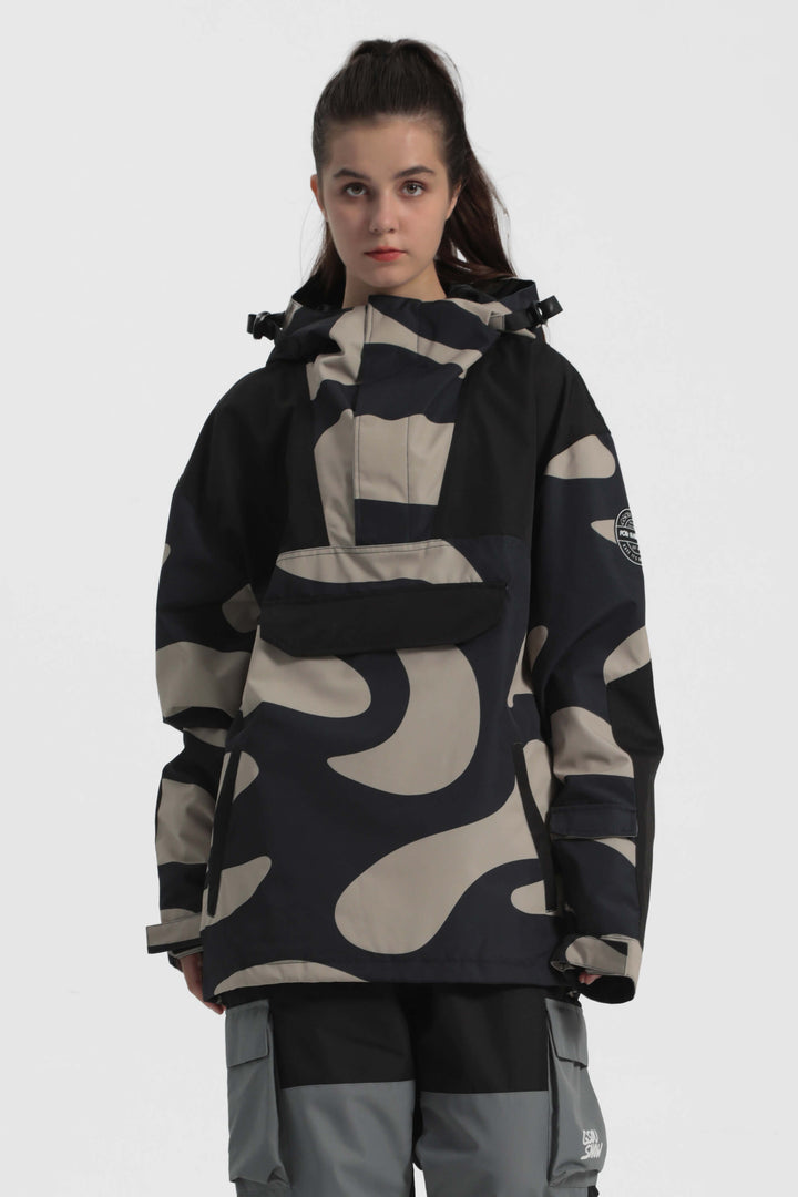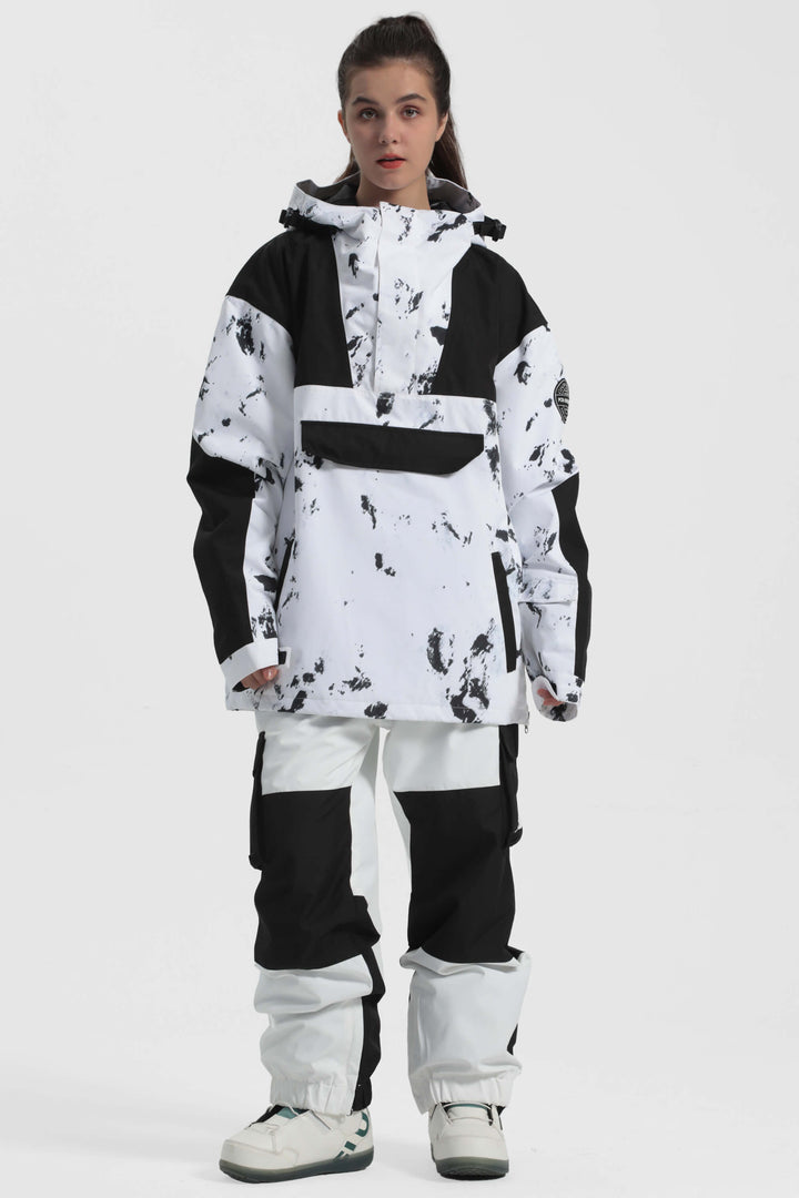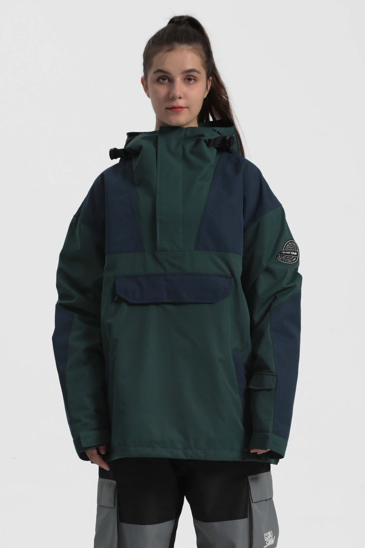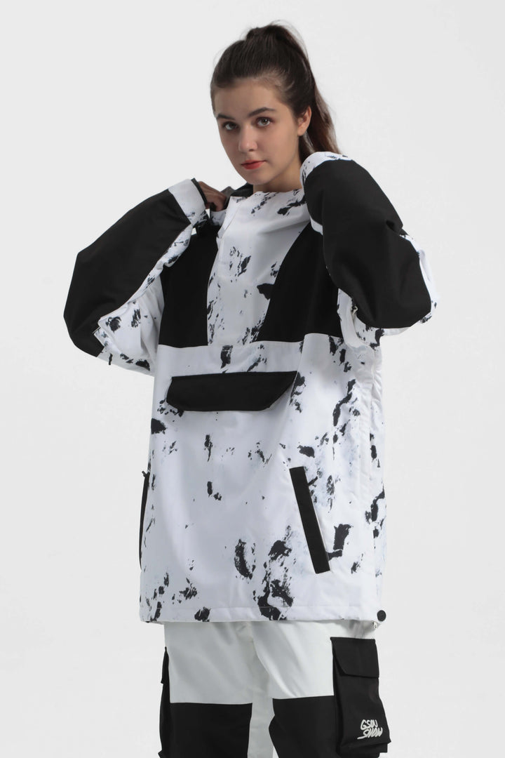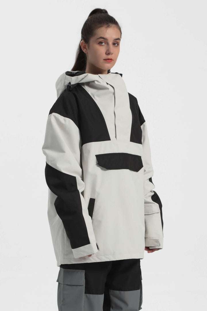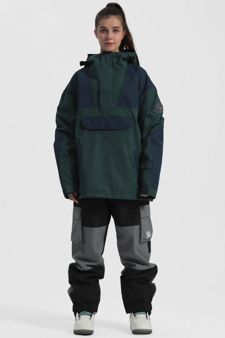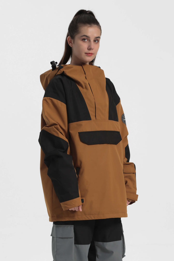 The GSou Snow ski Anoraks feature a color-block design and are both waterproof and warm. They also come with an adjustable hood, adjustable cuffs, and a powder skirt. Right-side underarm zipper vent allows for easy access to the bib, while the hem includes a drawstring and snap buttons.