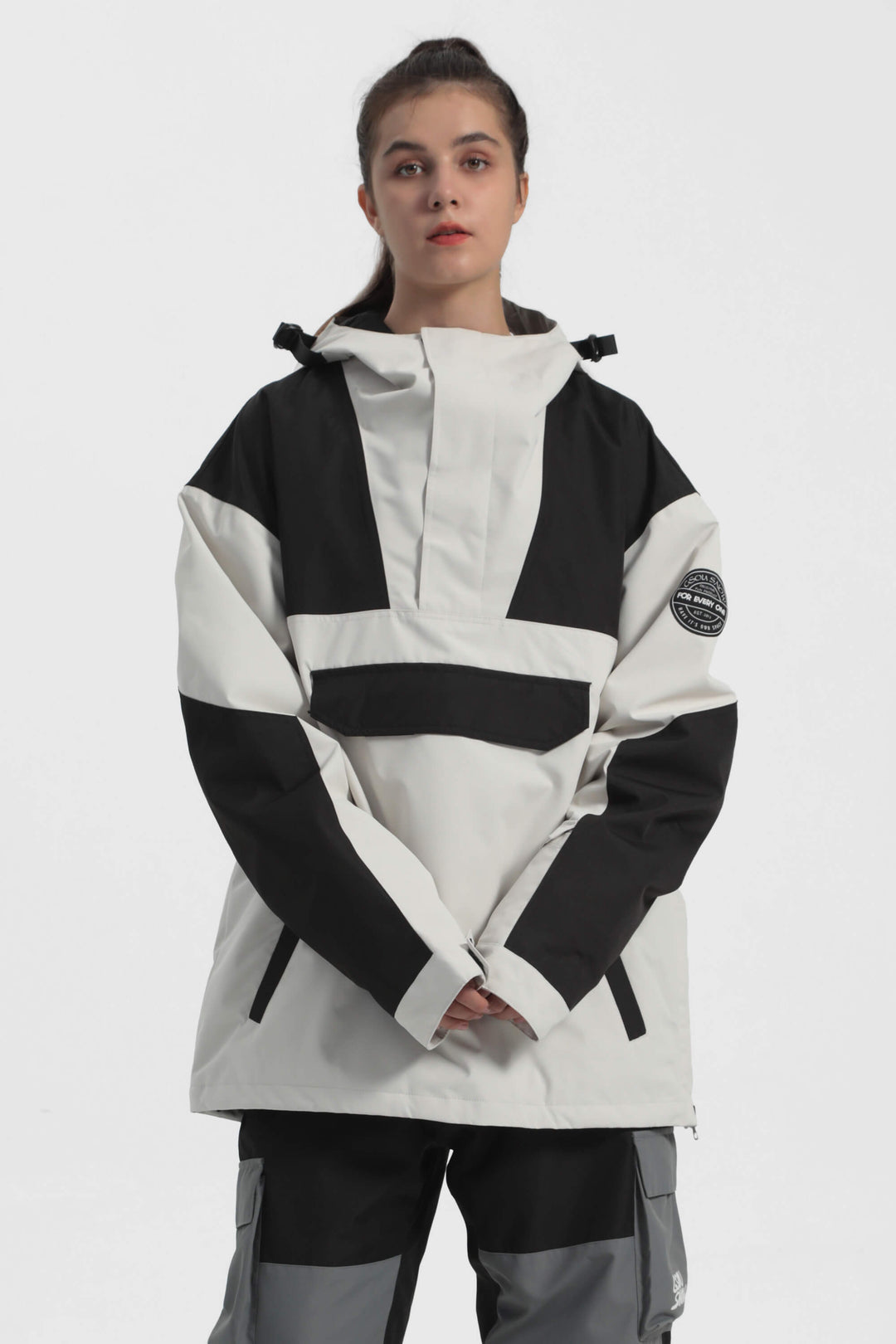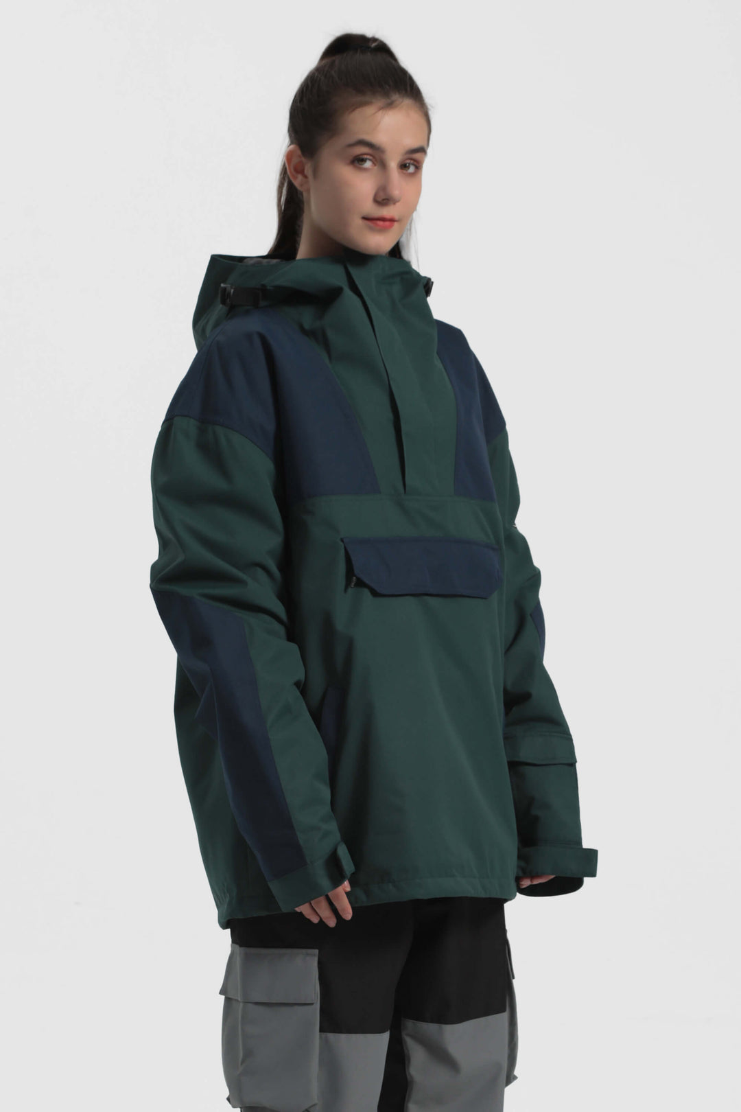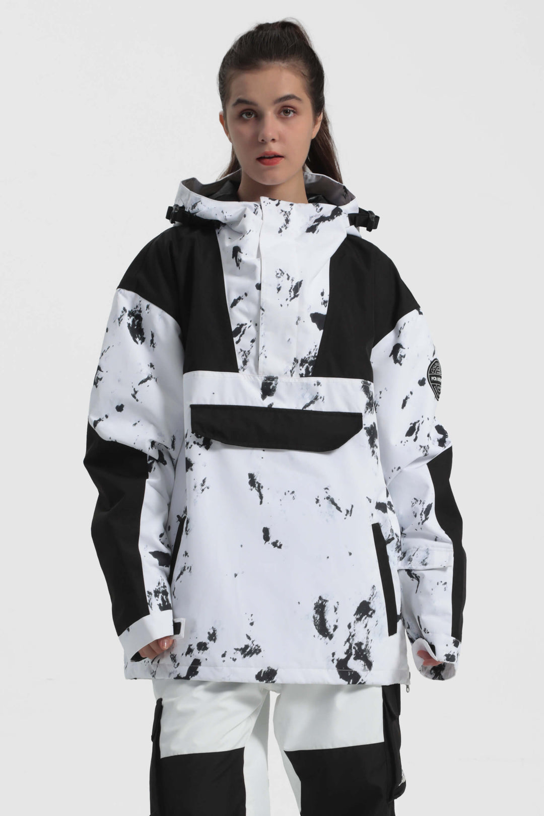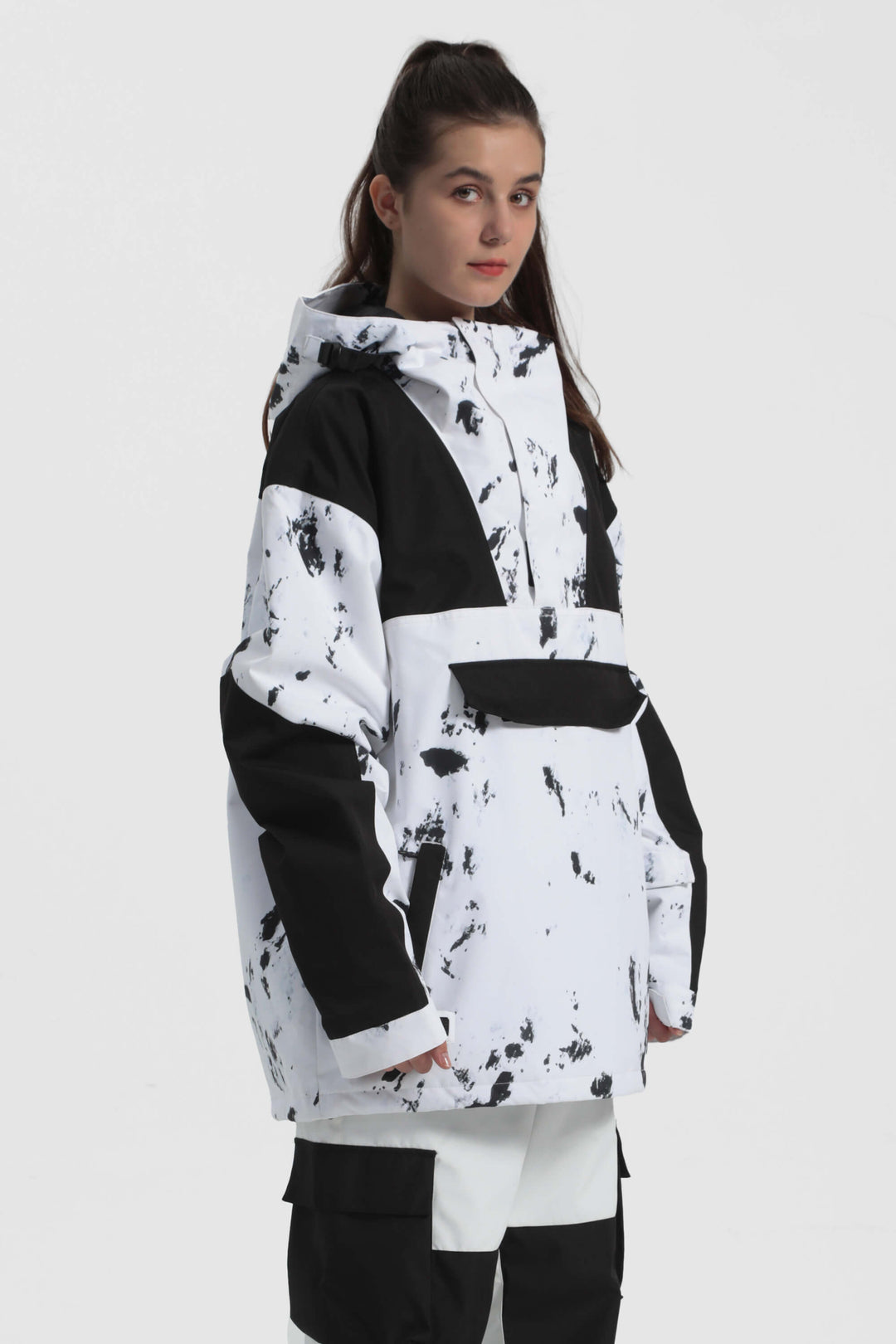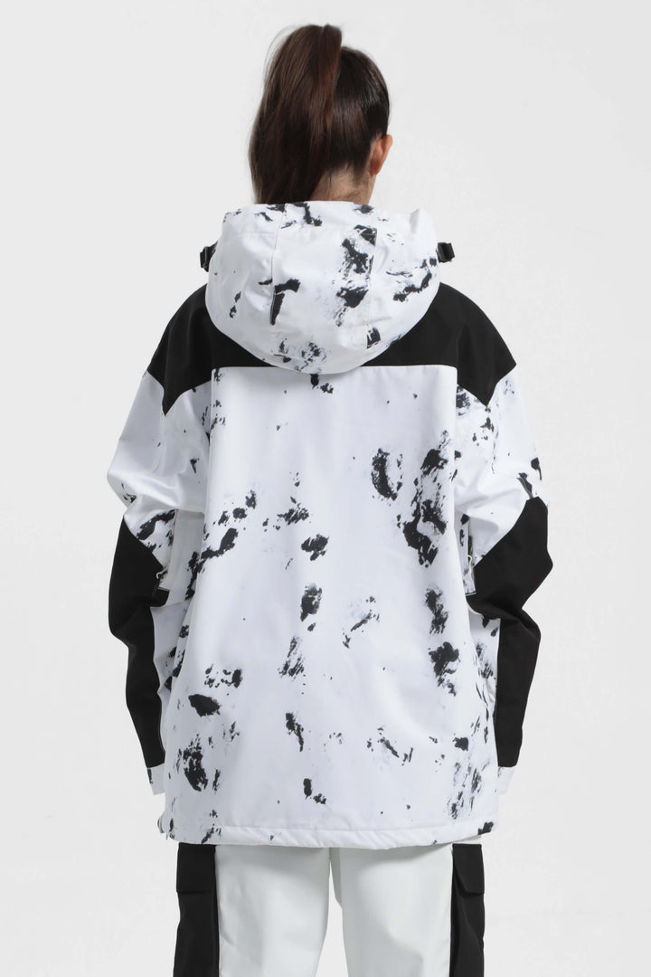 The GSou Snow ski Anoraks feature a color-block design and are both waterproof and warm. They also come with an adjustable hood, adjustable cuffs, and a powder skirt. Right-side underarm zipper vent allows for easy access to the bib, while the hem includes a drawstring and snap buttons.