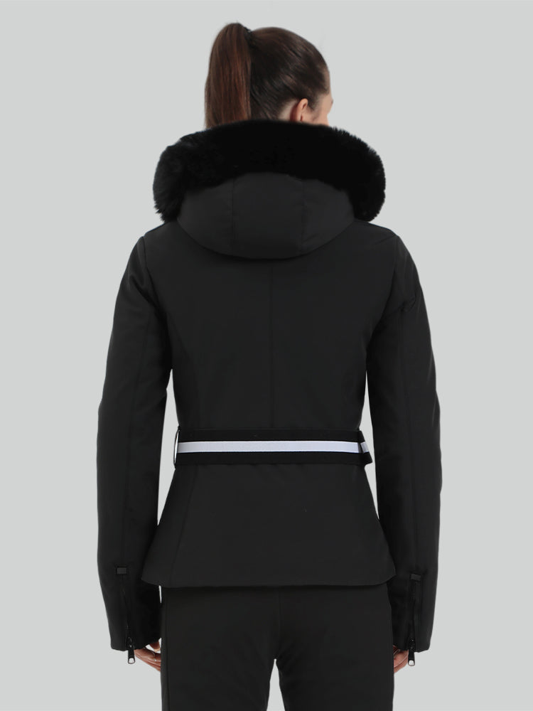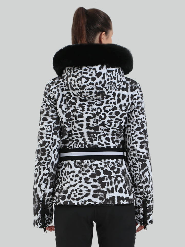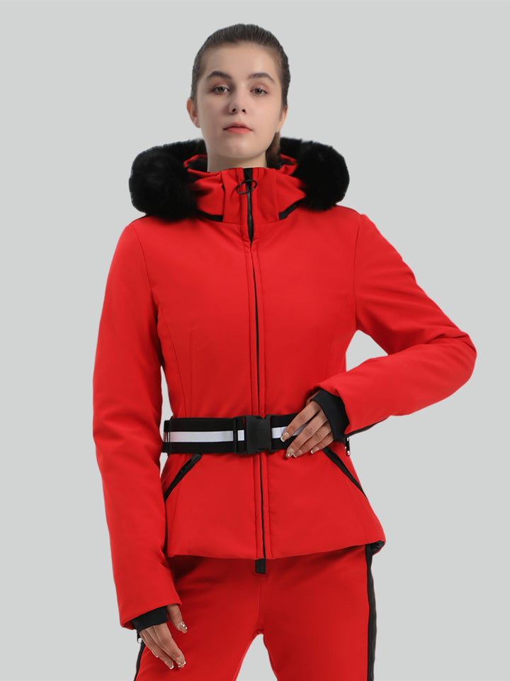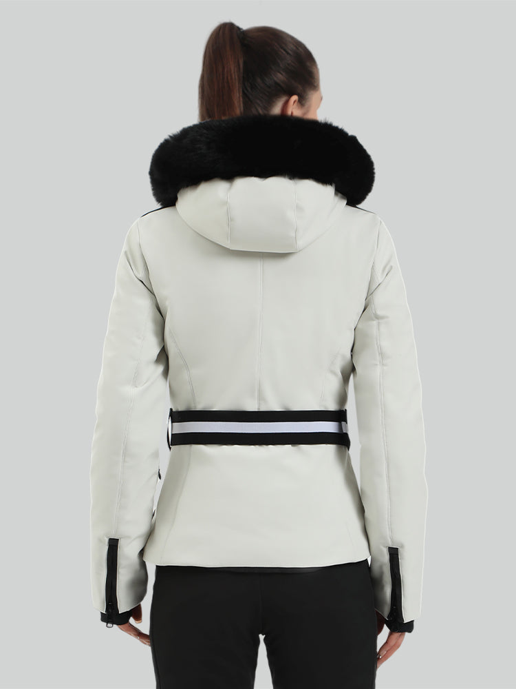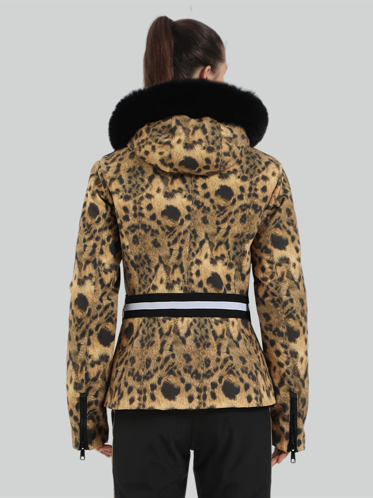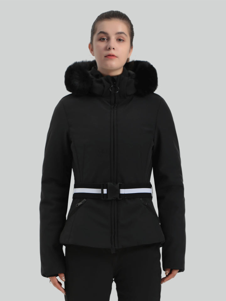 Warm duck down fills the hood and collar while warm polyester fills the entire body and is water-resistant and breathable, making it an indispensable piece of gear for skiing. The fluorescent shell adds both visibility and style. It also has a removable hood with faux fur trim.