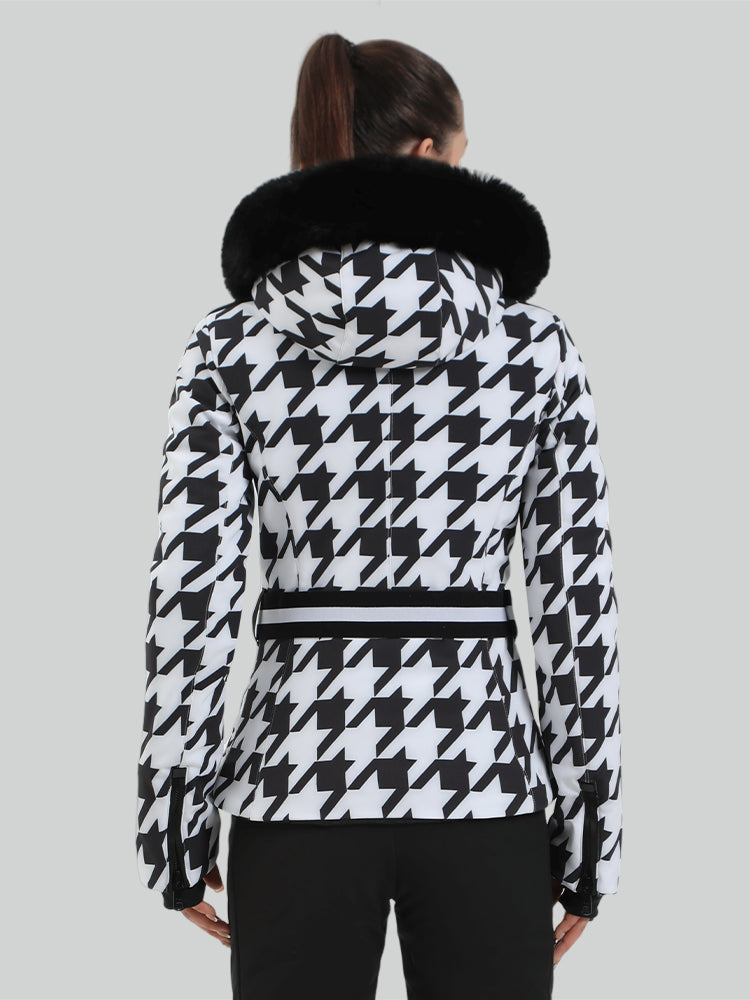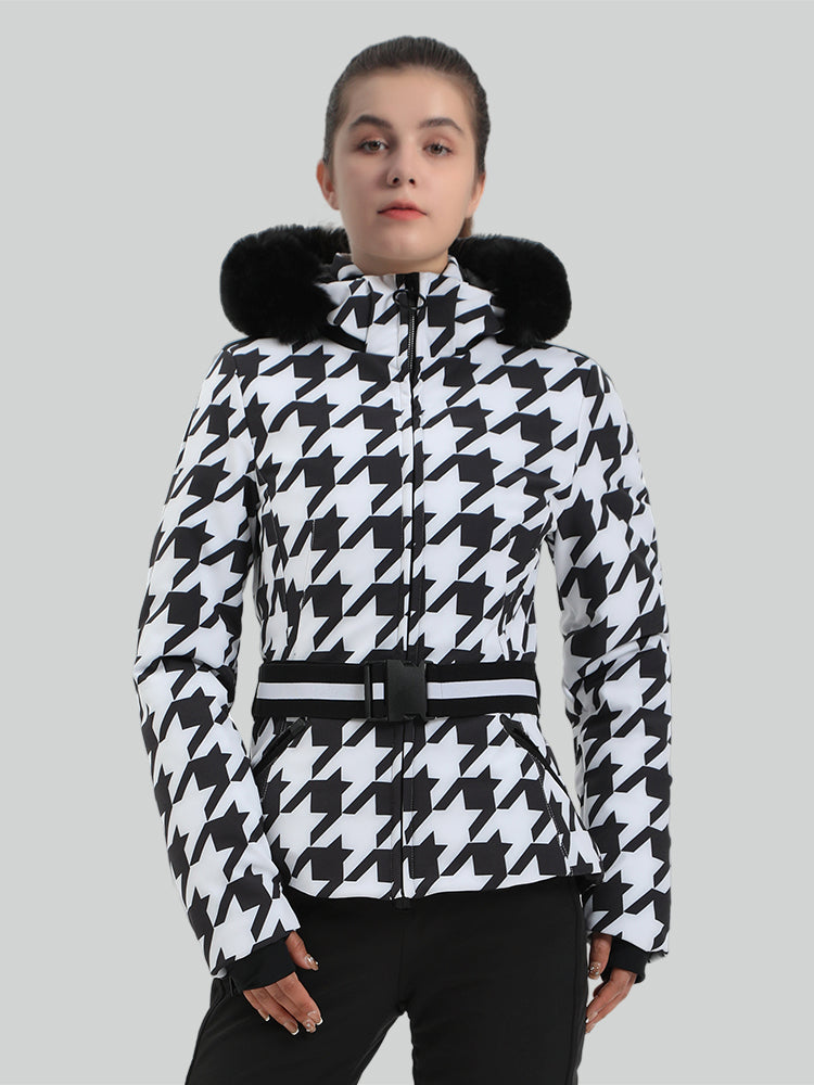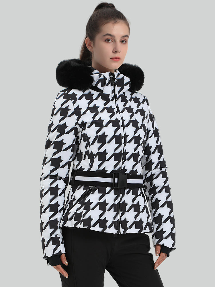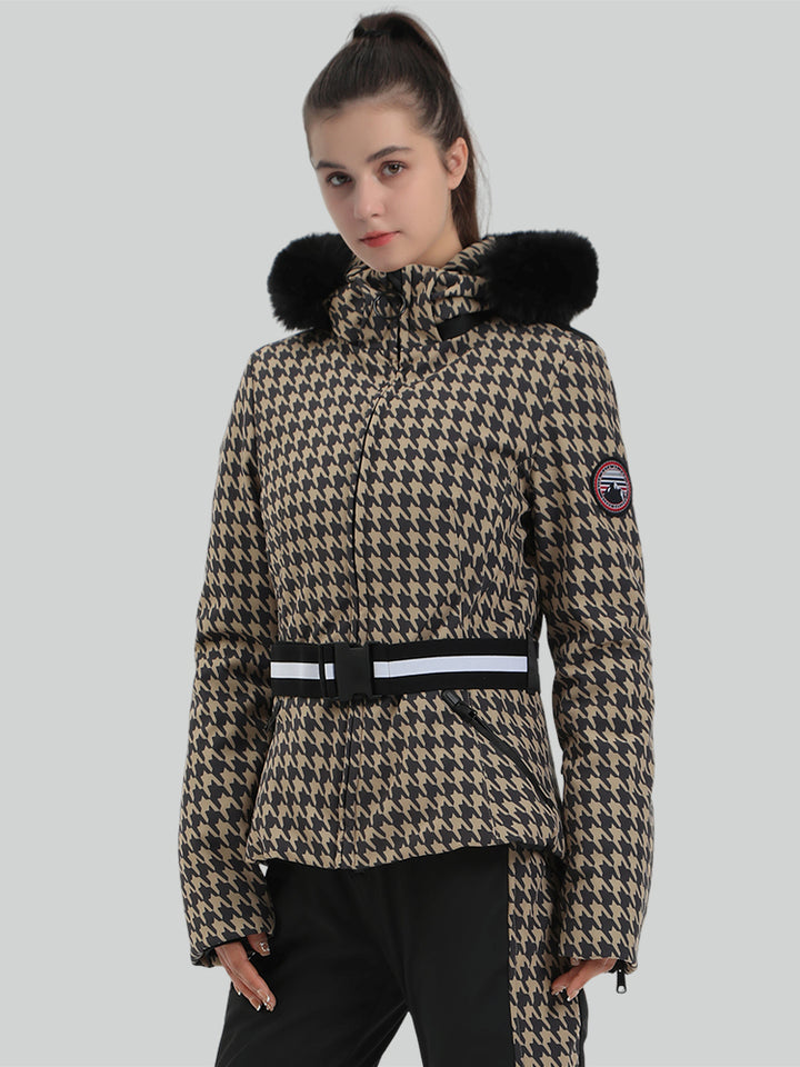 Women's Tan Houndstooth Slim Fit Belted Down Ski Jacket