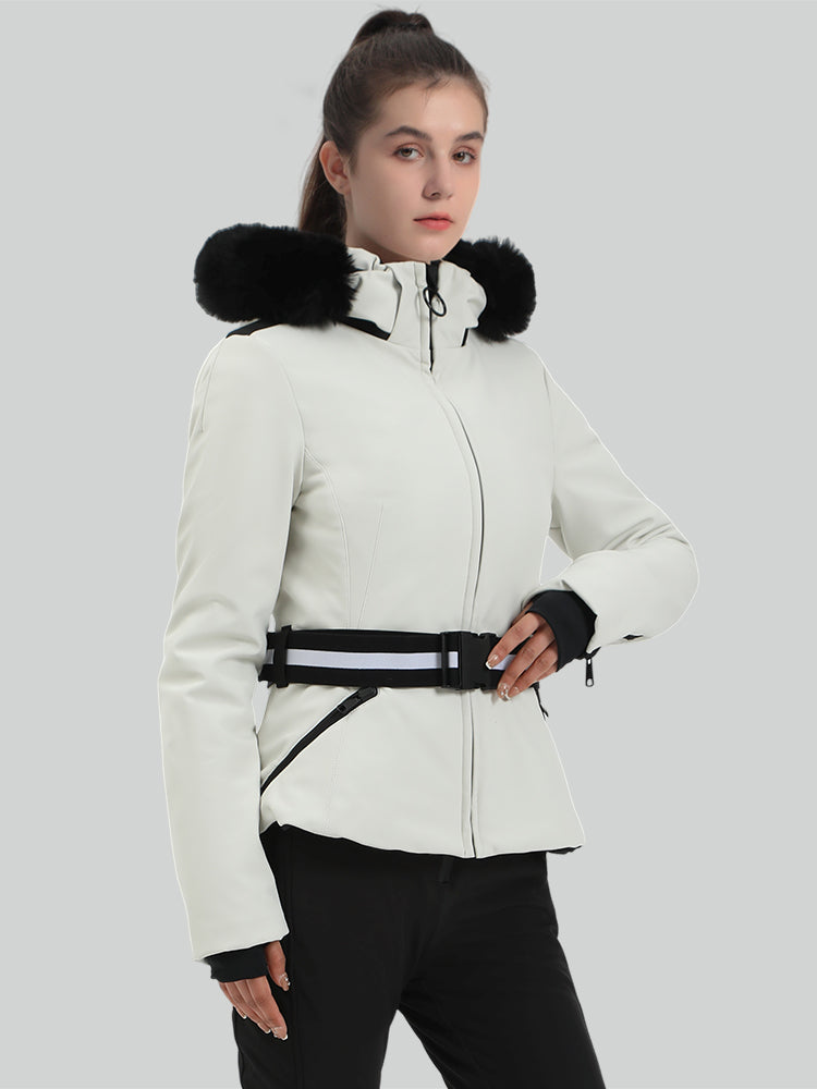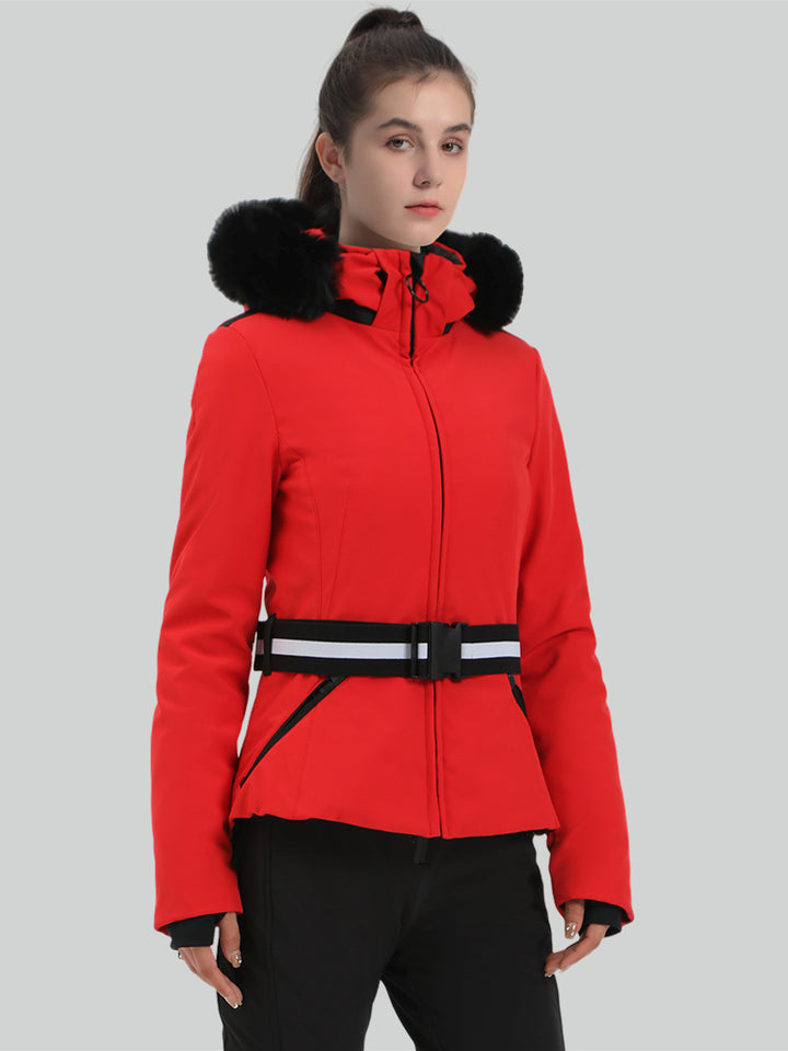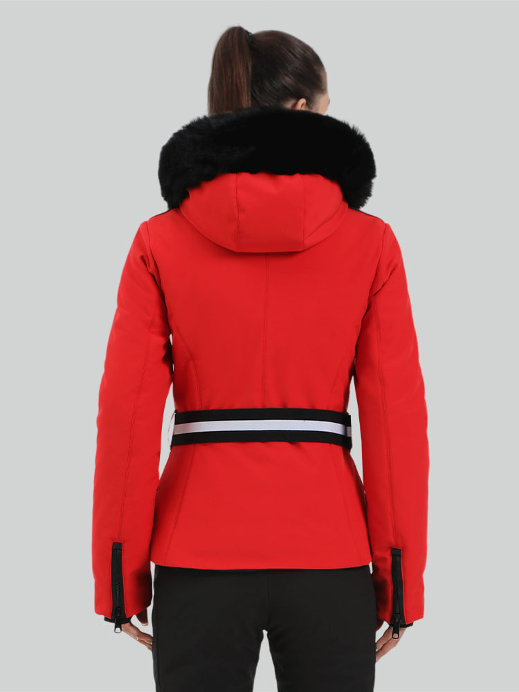 Warm duck down fills the hood and collar while warm polyester fills the entire body and is water-resistant and breathable, making it an indispensable piece of gear for skiing. The fluorescent shell adds both visibility and style. It also has a removable hood with faux fur trim.